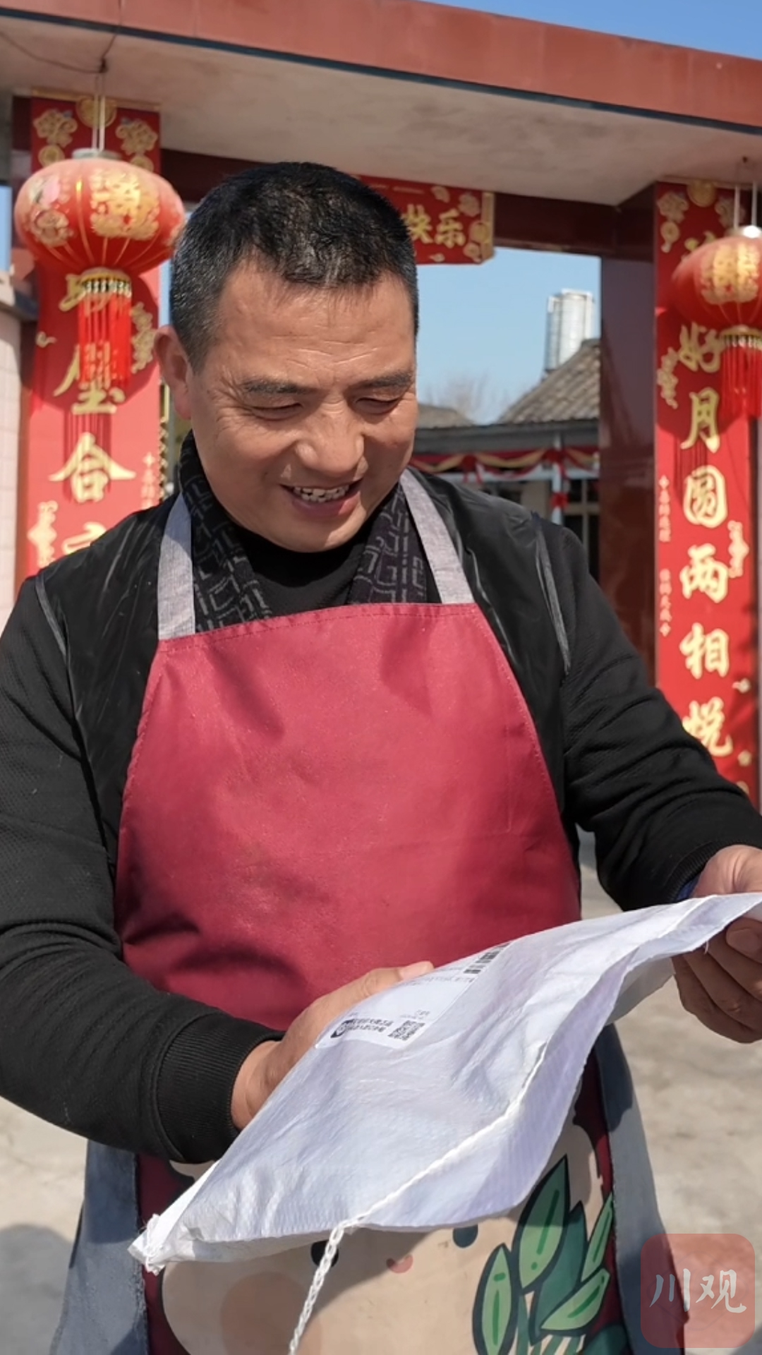 谢永中家大门贴着大大的“囍”字,系着挂脖围裙的谢永中开门迎接,我们打趣:这是四川好男人的过年标配。谢永中笑着欣然接受:“谢谢夸奖,在忙家务,要过年了,又刚添孙,屋头事多。”院子里晒着奶香的婴儿服和奶兜、包被,厨房里肉菜已经备好,小年餐很丰盛。