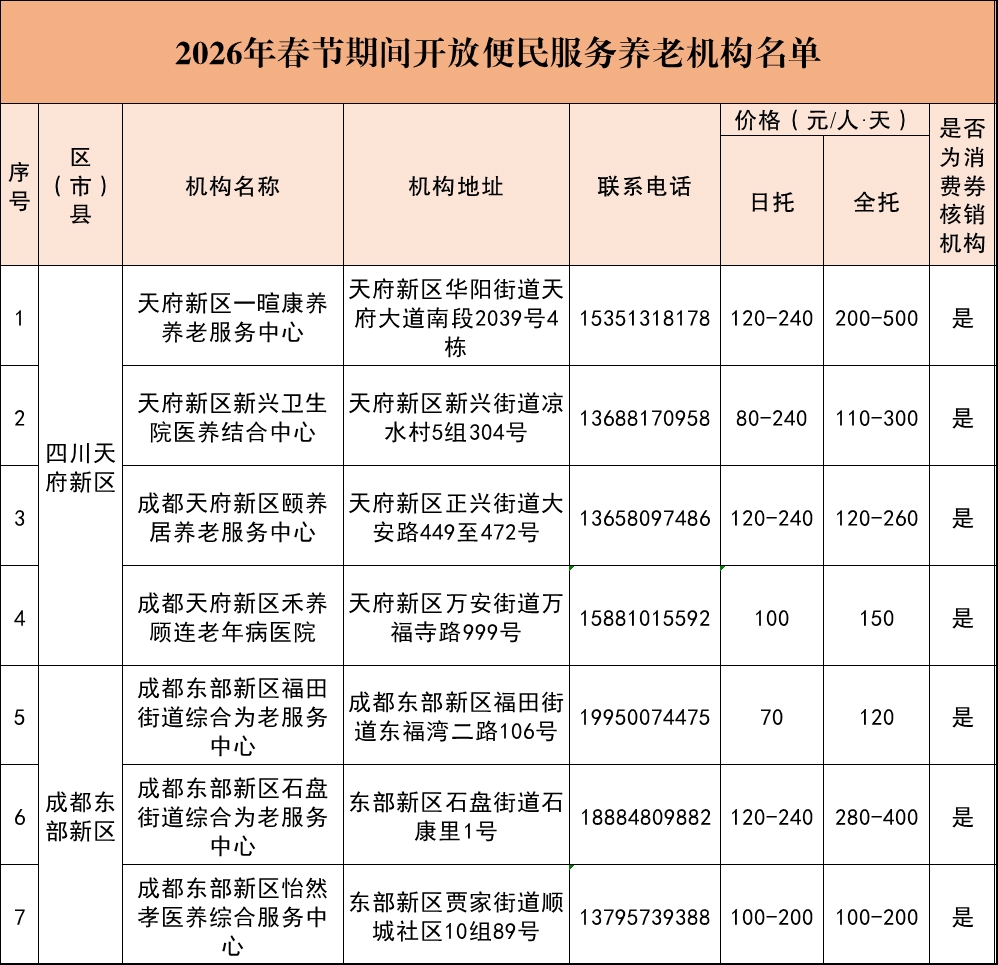 2月12日至3月12日,成都市依托现有养老服务机构资源,在全市范围内针对性推出短托养老服务,为有短期入住需求的老年人提供专业、规范的生活照料、康复护理等服务,满足其临时托养、短期体验或结伴居住等需求。本次服务覆盖全市23个区(市)县,共79家养老机构参与,均能使用养老消费券。