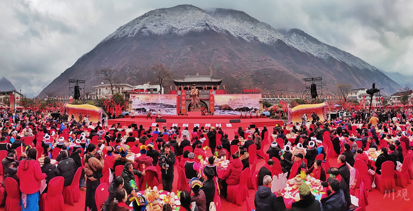 2月8日,阿坝州汶川县绵虒镇,矗立在大禹广场上的大禹雕像披上了羌红。雕像前方搭起舞台,红地毯铺满广场。在喧天的锣鼓声中,第二届阿坝州“村晚”启幕。