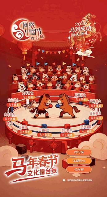 PS,本次“马年春节文化擂台赛”活动积分将按比例计入2026年“网络中国节”“马到成功闯关有礼”活动总排行榜。重阳节活动结束后,总排行榜排位靠前的用户还将获得额外奖励。