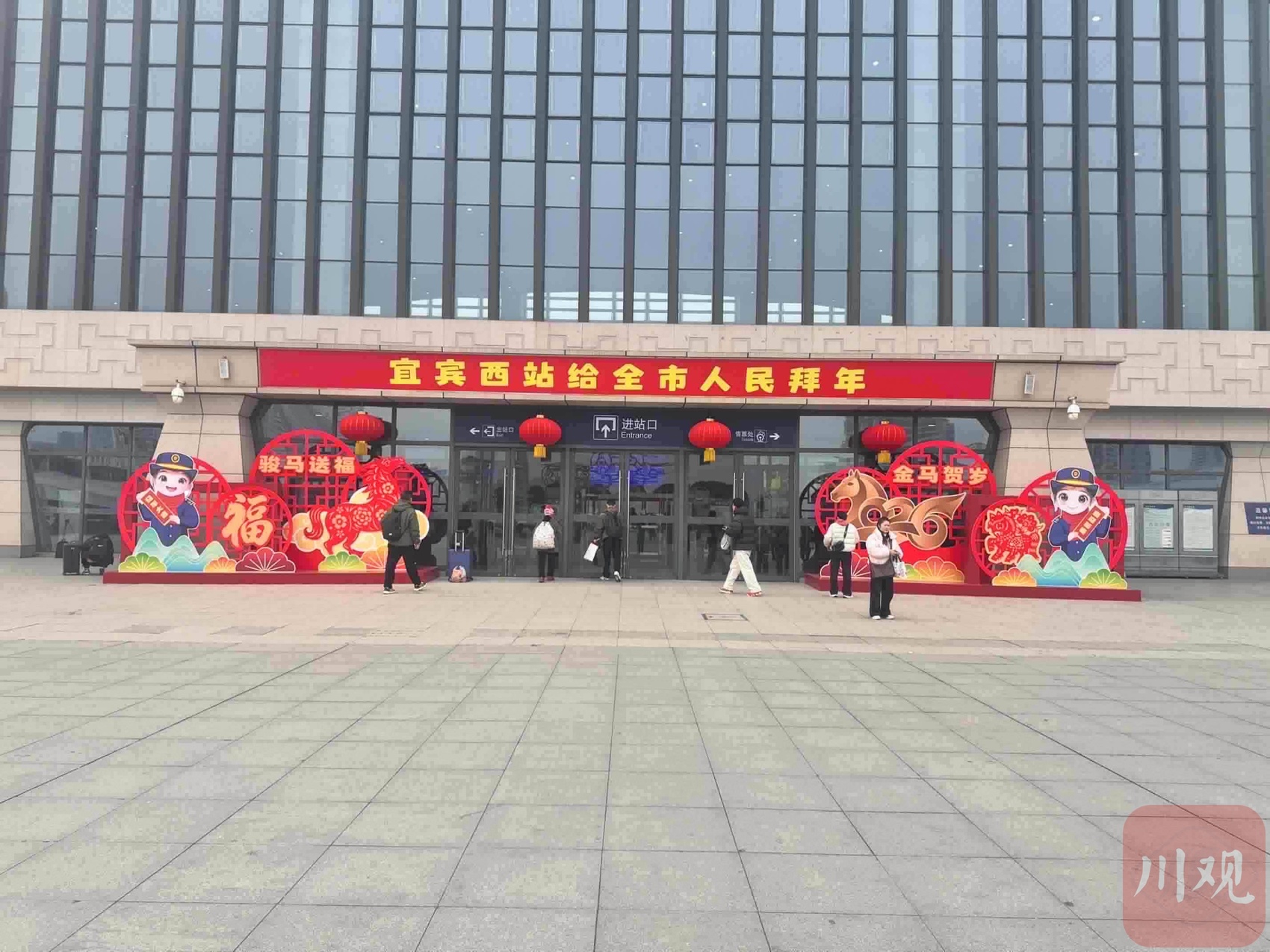 当天下午,宜宾西站出站口人流涌动。站台外,“宜宾西站向全市人民拜年”的标语前,不少刚下车的旅客举着手机拍照;站内,红灯笼、中国结早已挂上,年味扑面而来。