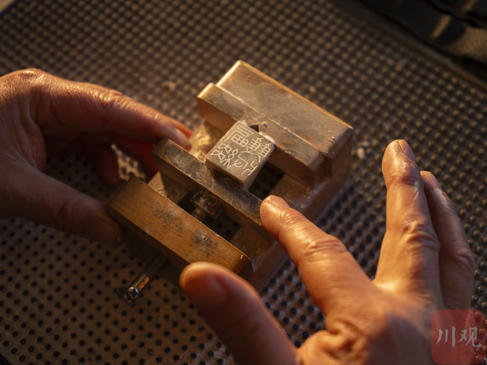 夜晚,杨泽强将刻好的印章印在纸上,反复检查。