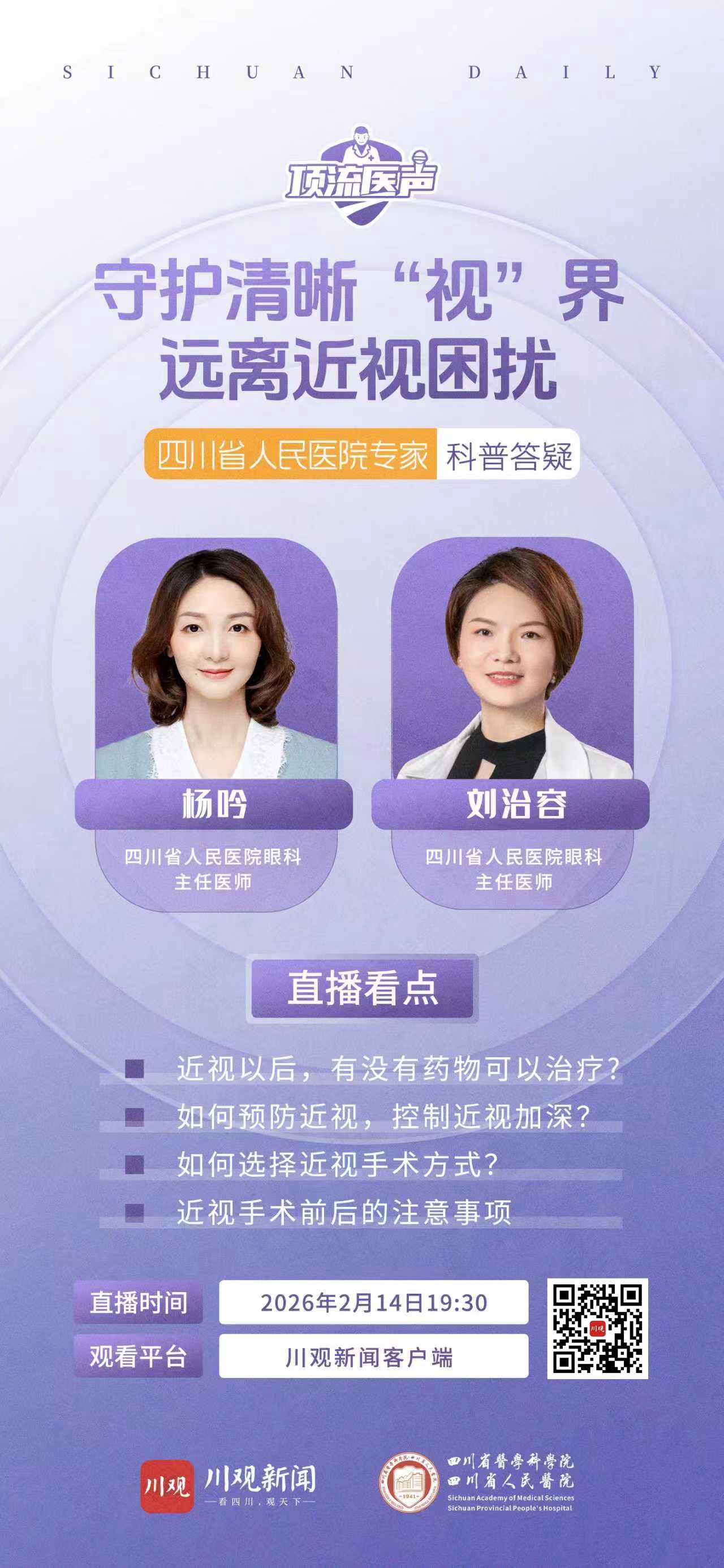 2月14日,川观新闻特别邀请到四川省人民医院眼科专家做客“顶流医声”直播间,聚焦大家关心的视力问题,带来实用的护眼科普,帮助我们守护每一份清晰“视”界。