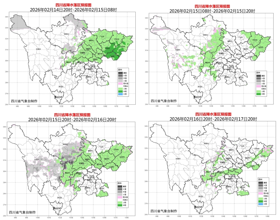 根据今天的最新气象资料分析,四川省气象台预计,今天(2月14日)夜间到16日,盆地有一次降温降水天气过程,日平均气温将累计下降3~5℃,东北部局部可达6℃或以上,大部地方有小雨,东北部局部有中雨,高海拔山区有雨夹雪或小雪,冷空气影响时部分地方有4~6级偏北风,局部风力可达7级或以上。