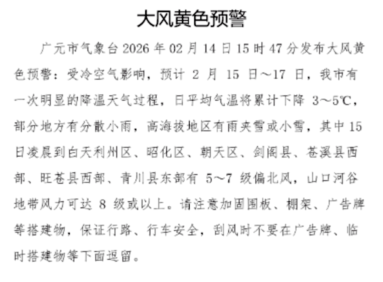 今天15时47分,广元市气象台发布了大风黄色预警。截至17时30分,四川境内有以下气象预警信息正在生效中: