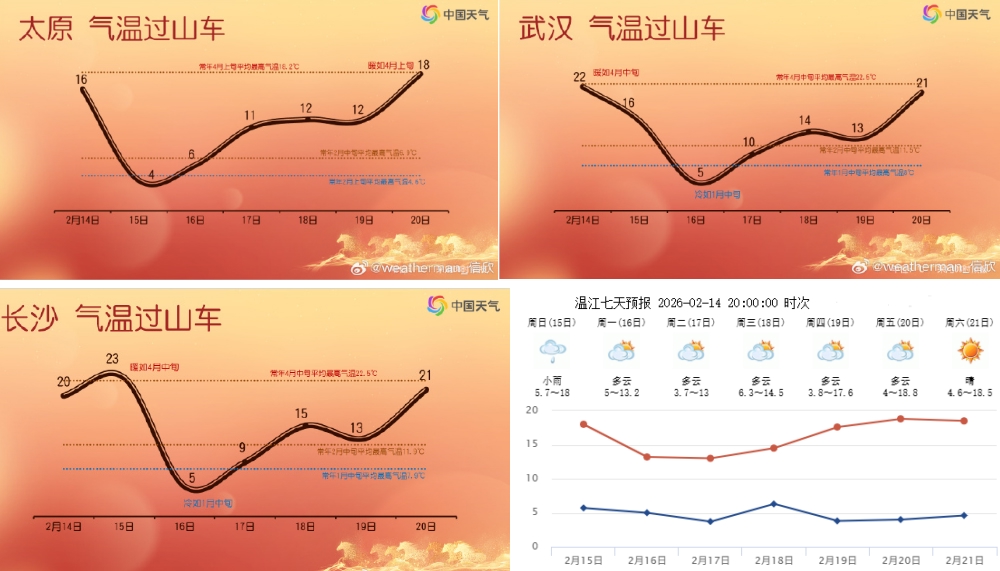每年秋冬交替和冬春交替时,最容易看到气温的“过山车”走势。从全国范围看,今年春节我国中东部一些城市将开启“过山车”模式,比如山西太原、湖北武汉、湖南长沙。再往后,气温可能还会下降,之后再上升,但大趋势是震荡向上的。