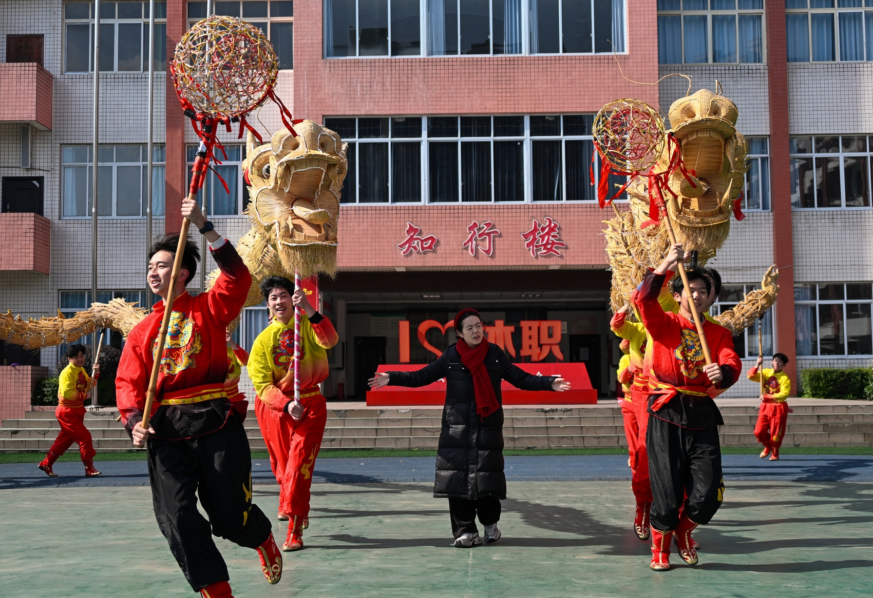 片刻后,旋律起。这群少年又走上操场,金黄的草龙凌空一抖,龙须在晨风里轻颤,龙头跟随灵活的龙球已然舞出少年们的龙马精神。