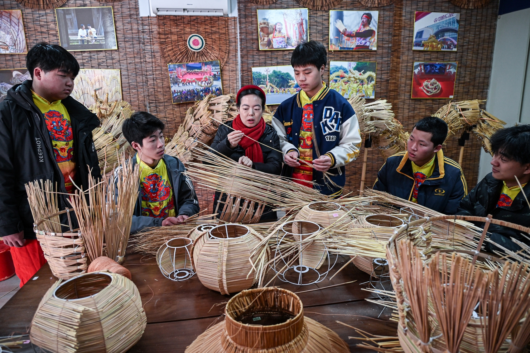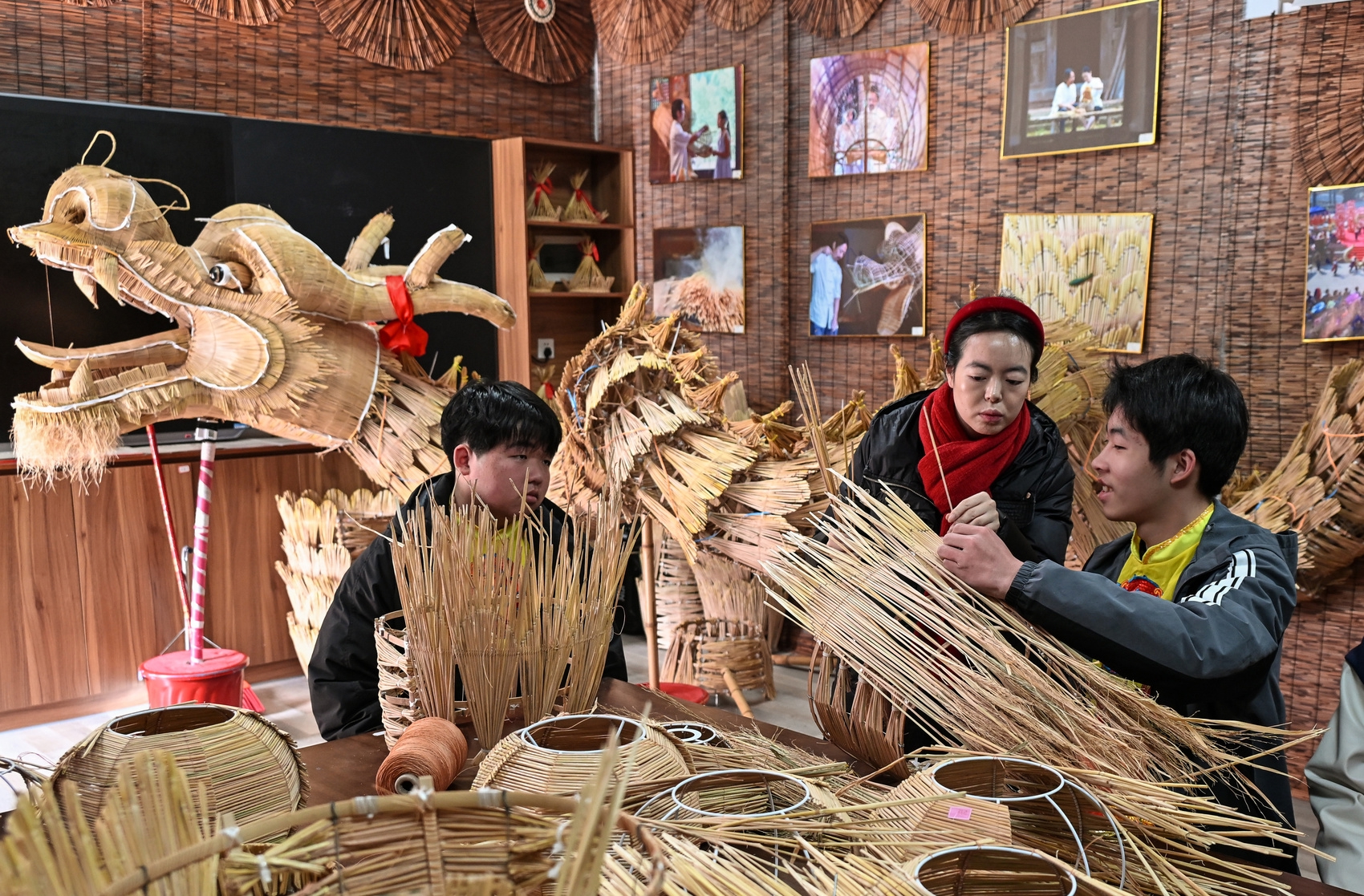 舞龙少年们正是陈丽燕的得意门生。因为多次表演,教室中的草龙龙身后段龙鳞已经有些磨损。训练之余,陈丽燕也正带着少年们学习修补。只见指尖翻飞间,一根根精选的稻草被嵌入龙鳞,一次次练习中的熟能生巧,也带给这群“00后”和“10后”们更多的成就感。