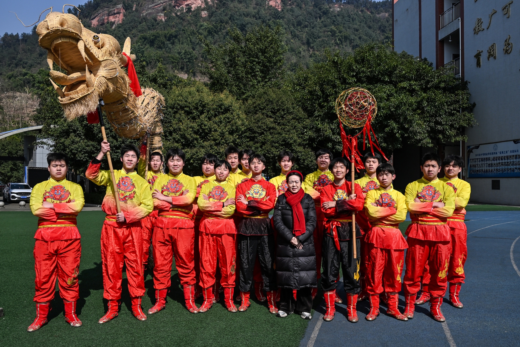清晨的薄雾中,沐川县中等职业学校操场,十余名少年早早到来,压腿、举杆、校准龙头重心、一遍遍走位练习,少年们额头沁出汗水。一旁,沐川草龙第五代非遗代表性传承人陈丽燕的声音不时响起:“注意龙球的走位,龙尾节奏跟上。”