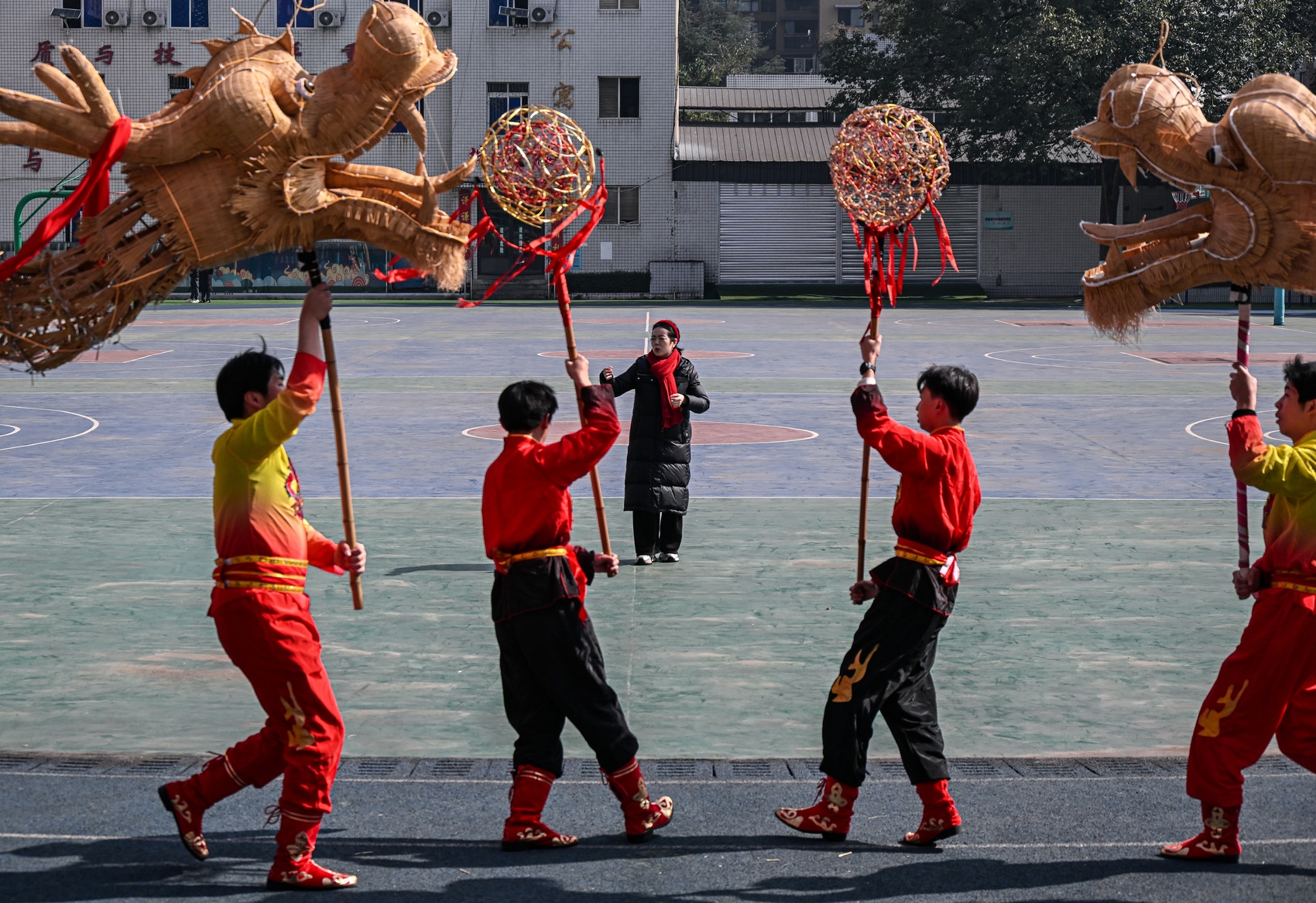 沐川县中等职业学校操场,少年们练习舞龙。