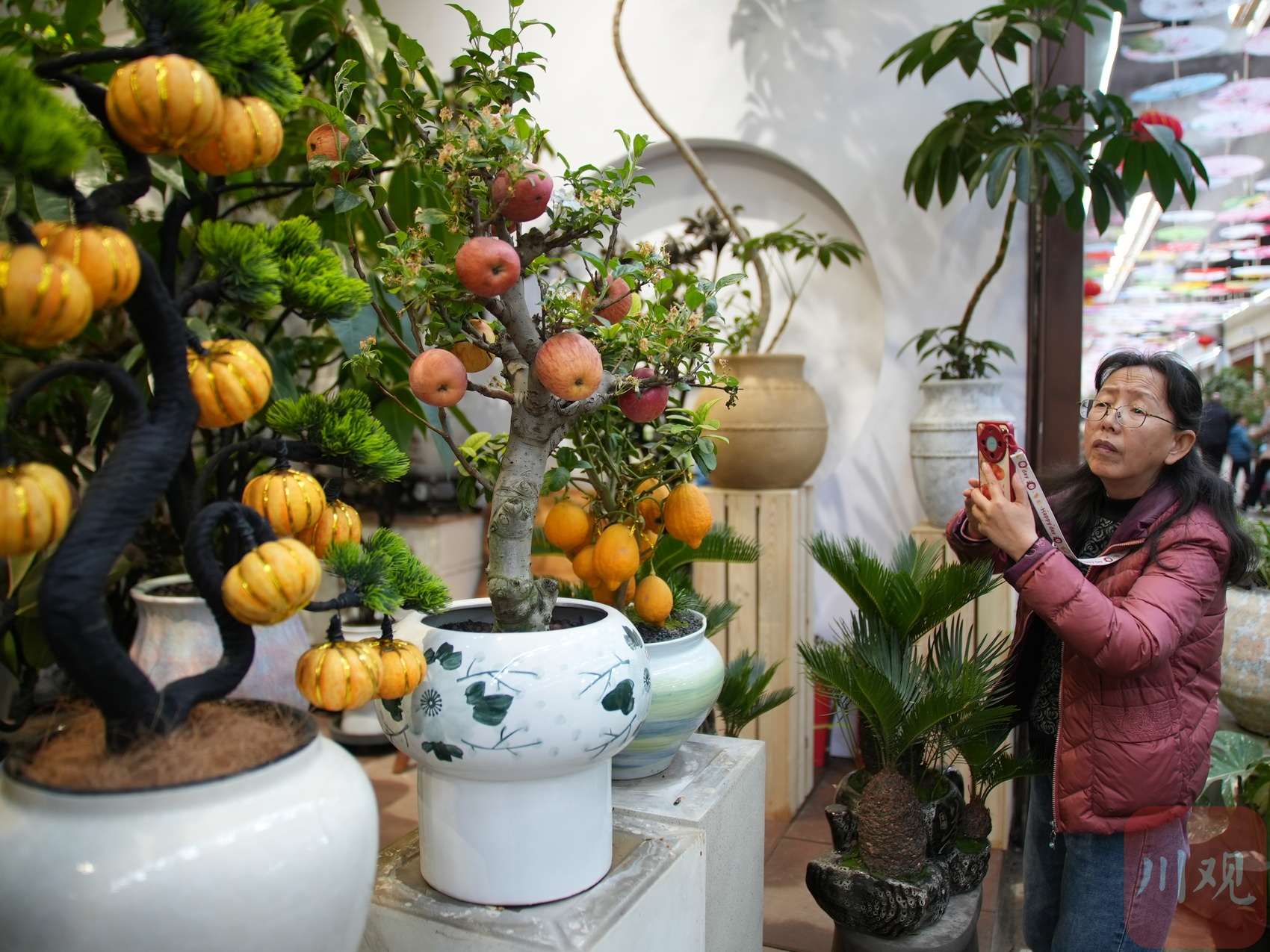 三圣花市内的“苹果盆栽”吸引了不少市民的眼光。