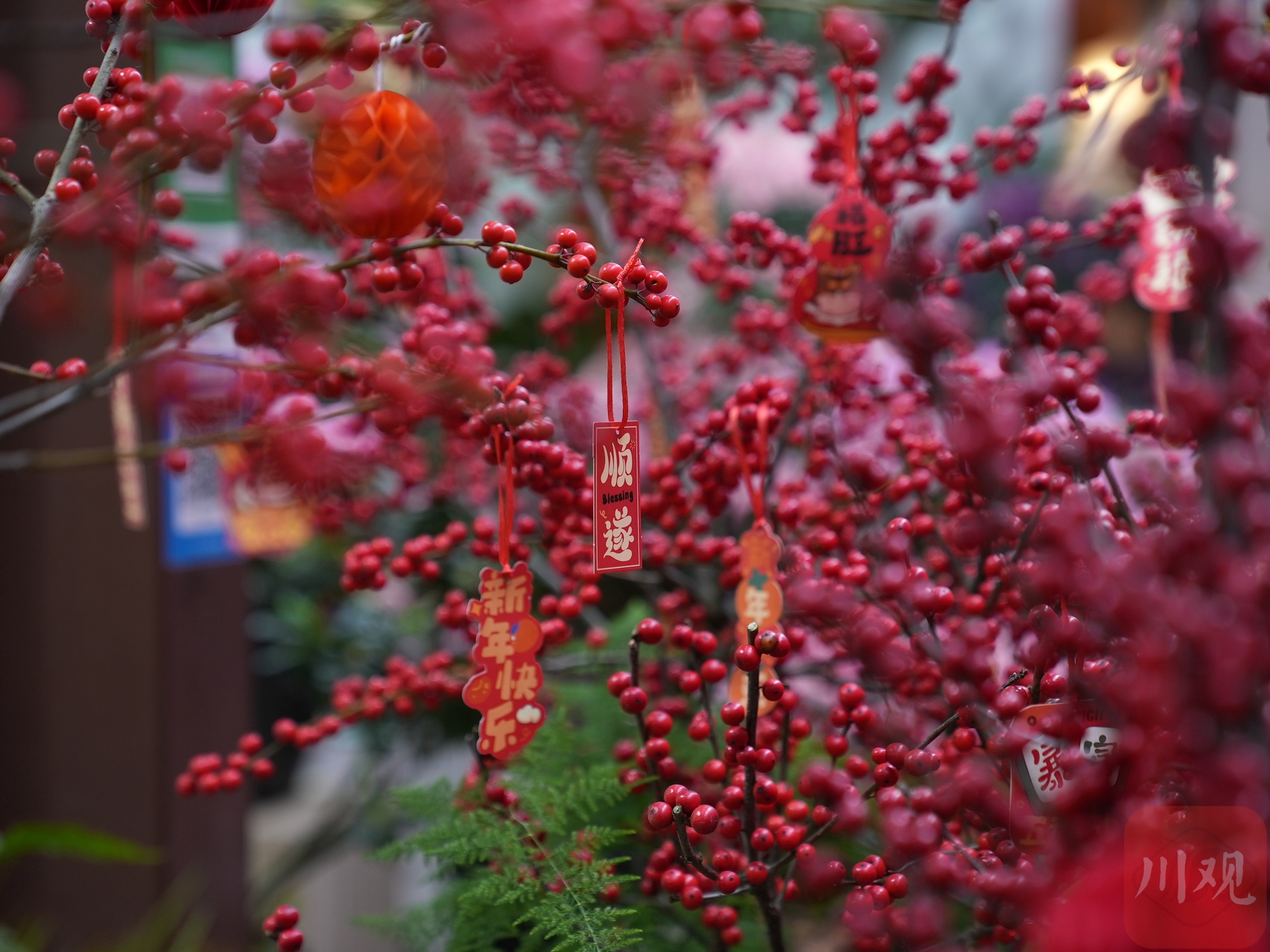 2月15日,三圣花市,一簇冬青挂满了吉祥语。