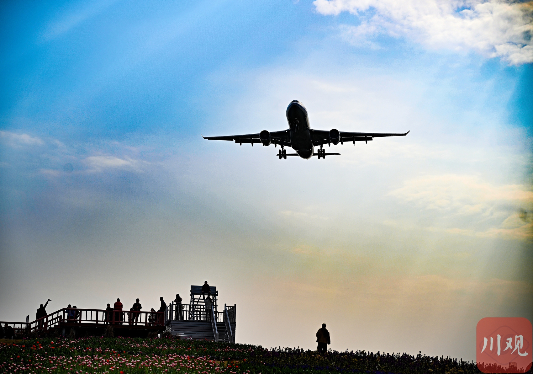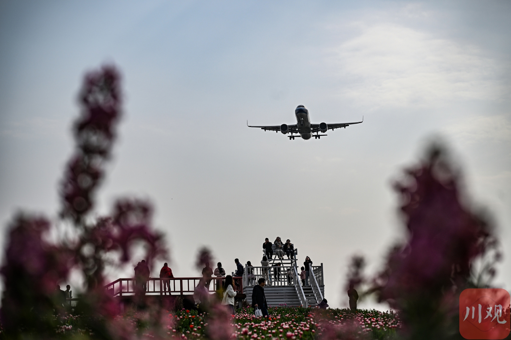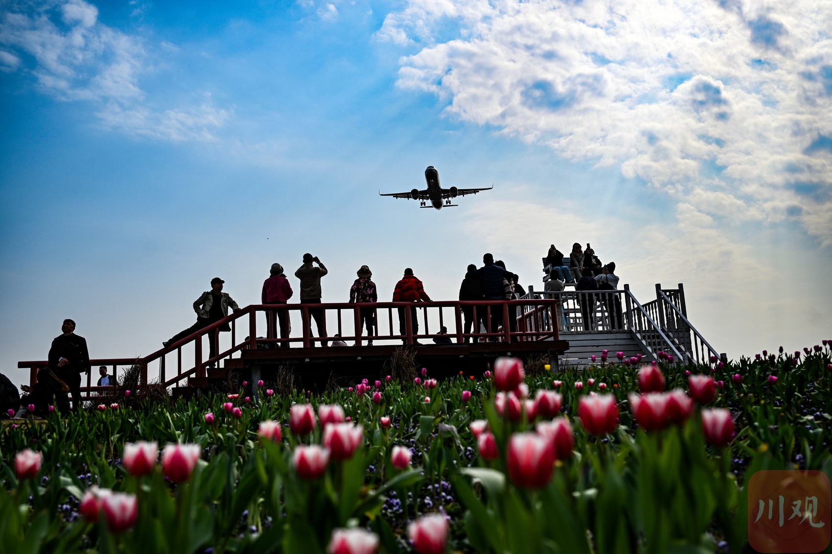 2026年2月15日,游客在成都市双流区空港花田打卡观机赏花,一派春意盎然景象。