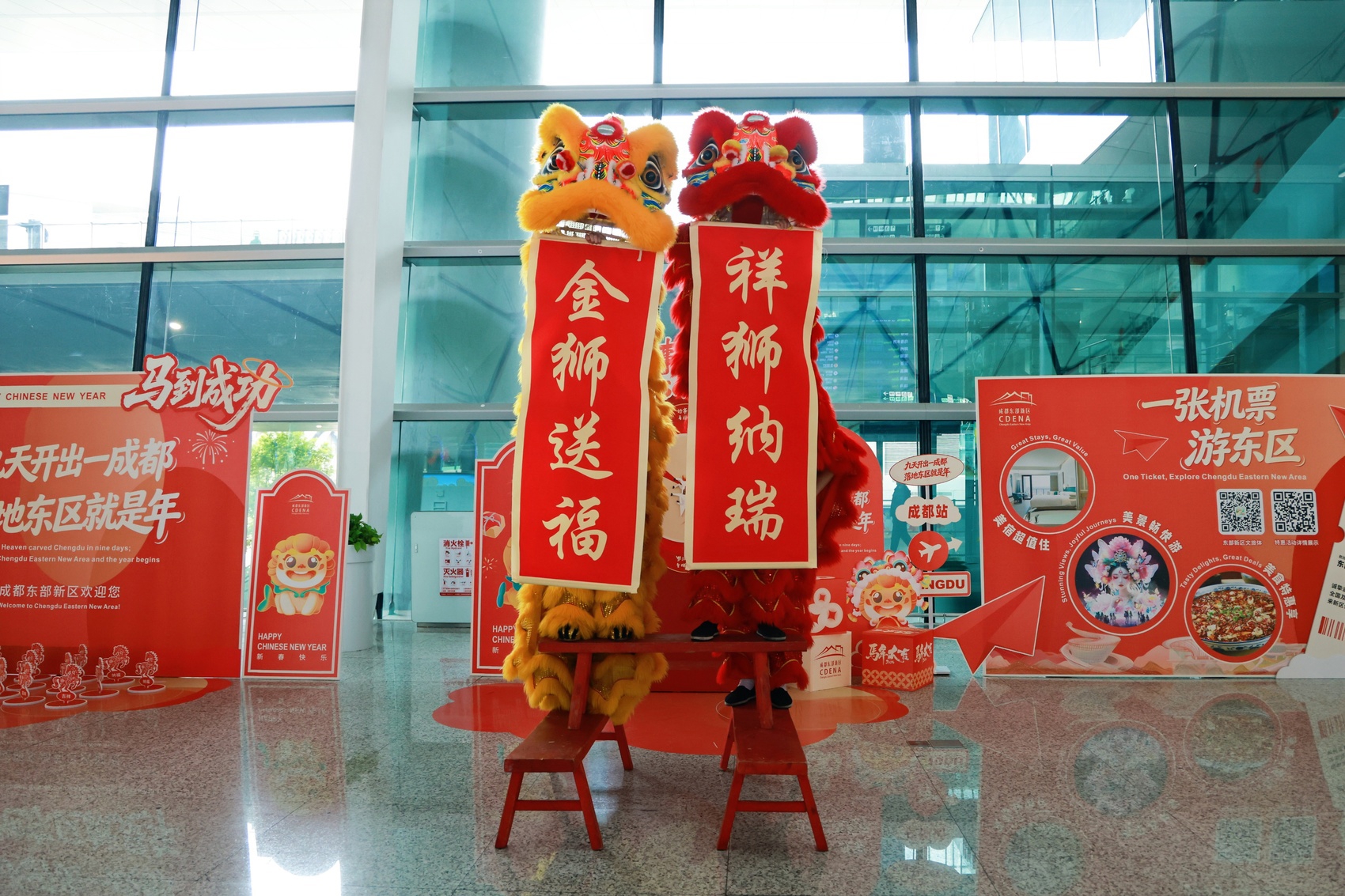 航站楼内红灯笼高挂,金狮舞动,悠扬的京歌与川剧唱腔在航站楼里回荡……2月15日,成都天府国际机场一片热闹景象。前一天,“九天开出一成都·落地东区就是年”2026年春节文旅主题活动上线,将持续至2月19日。期间,每日14时至17时,T1、T2航站楼到达大厅化身“新春会客厅”,为抵离旅客献上一场年味盛宴。