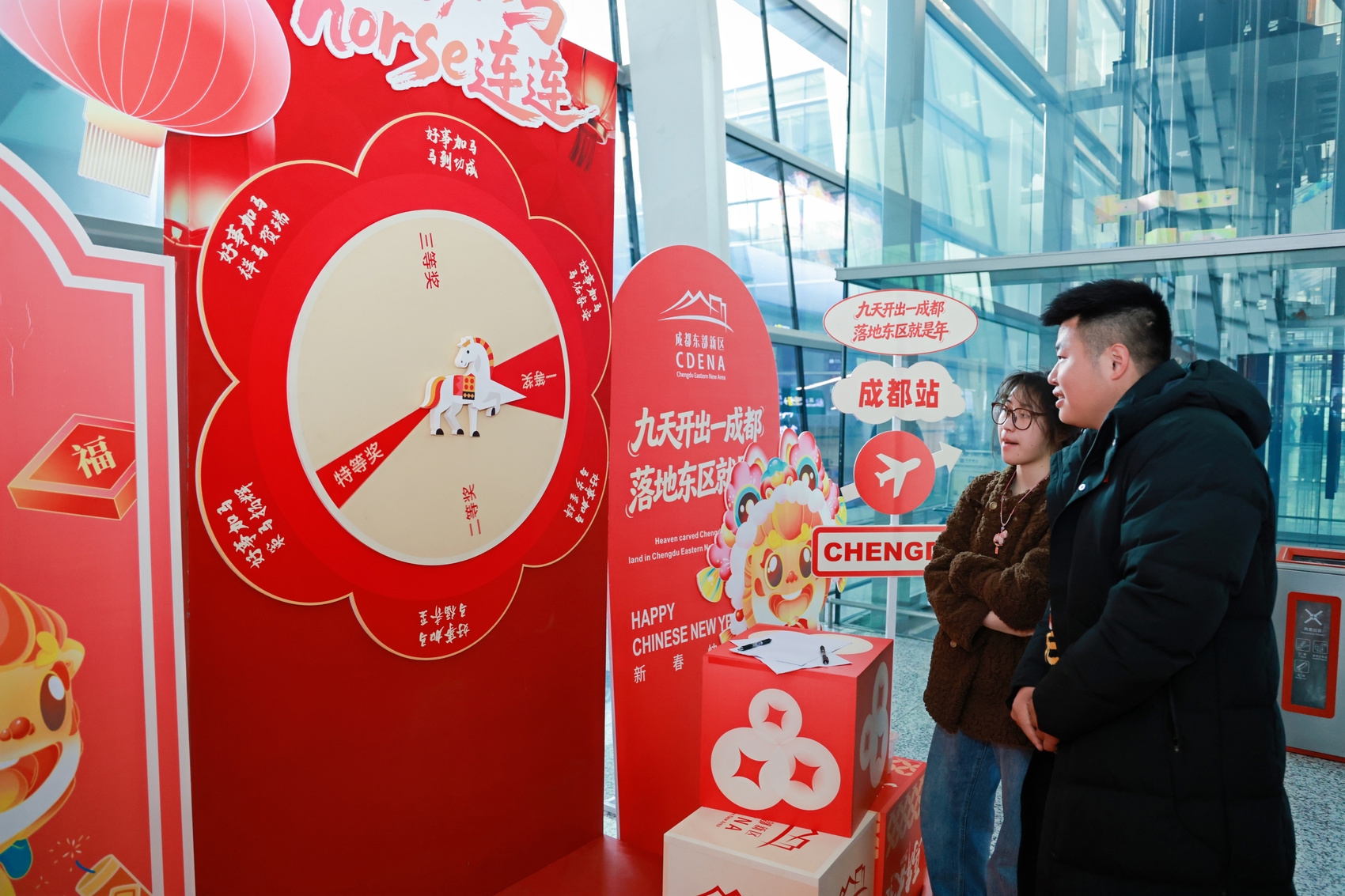 不远处的幸运转盘抽奖处同样热闹。“我抽到了萌狮中国结,太开心了!”刚从广州转机的旅客王先生拿着奖品说。据了解,旅客凭当日机票可参与1次抽奖,中转旅客凭联票还能额外获得1次机会,获取成都东部新区的景点门票、定制文创、萌狮中国结等好礼。