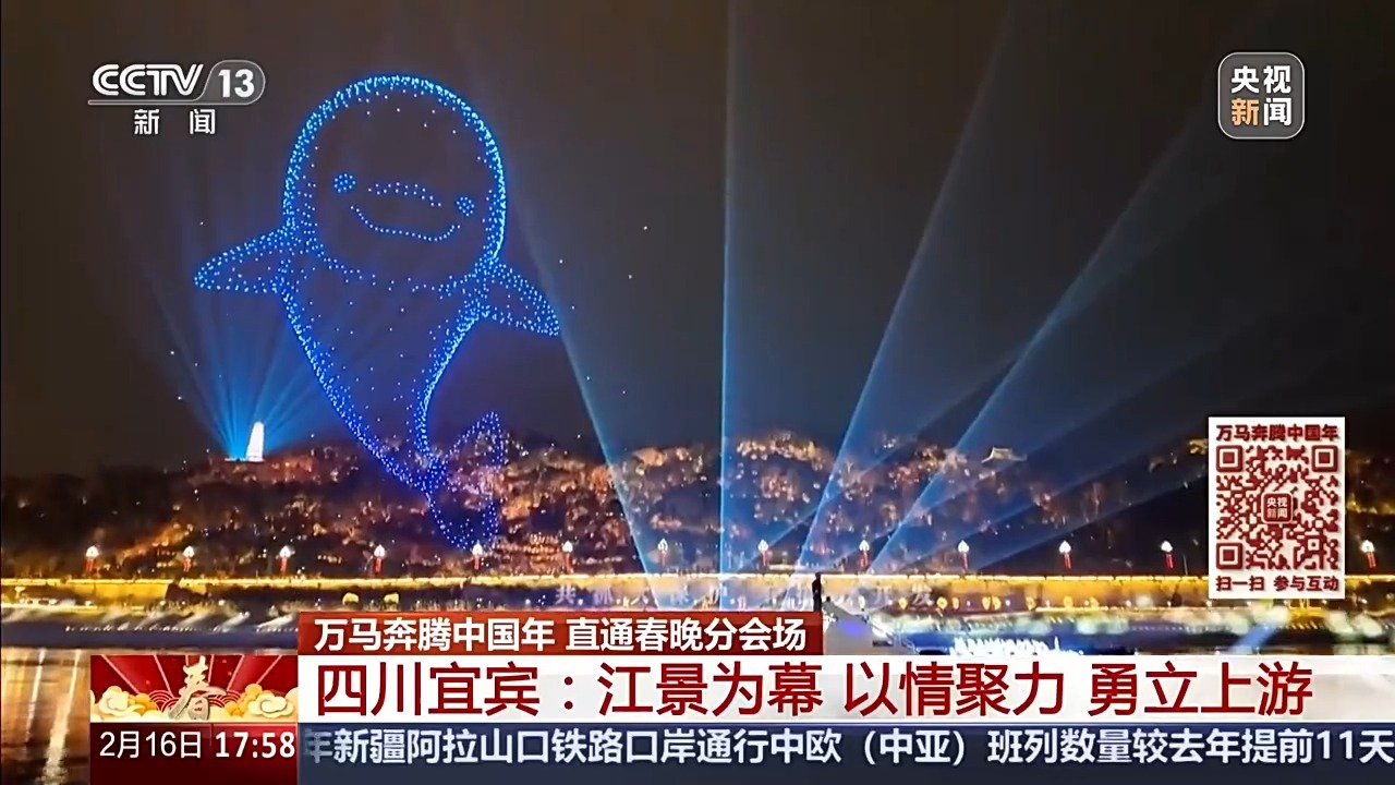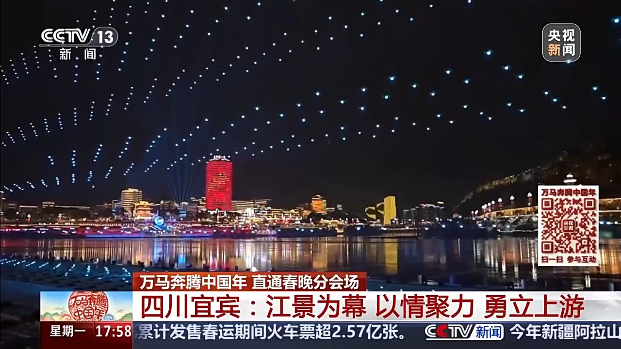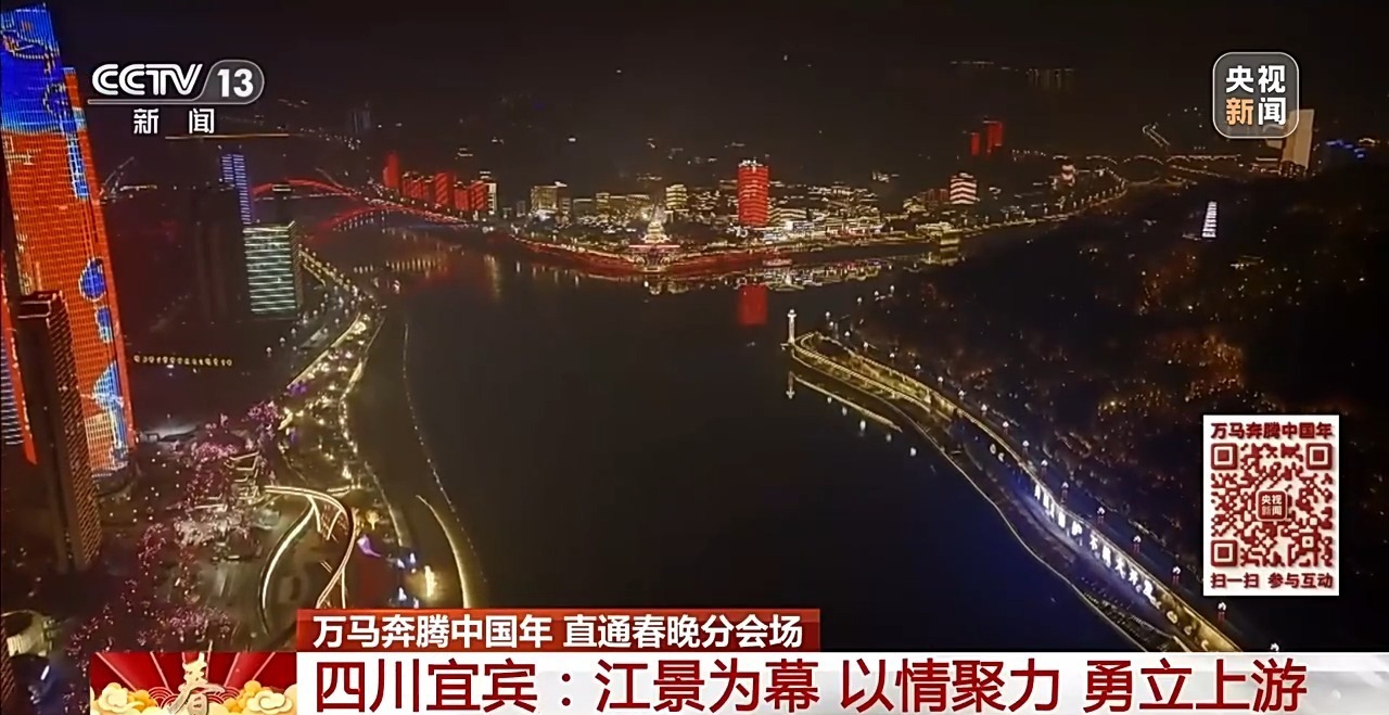 从水上到空中、从主舞台到城市背景,今晚您看到的,将是一场艺术与技术在长江上空完成的、难度极高的协同创新。这场以城为景、以江为脉,讲述“上游担当”、凝聚“上游精神”的“春酒”,马上就要个从这长江原点,奔向千家万户。祝大家能够身临其境地感受到长江之滨的这份辽阔、热闹、欢喜,跟着宜宾勇“立上游”。