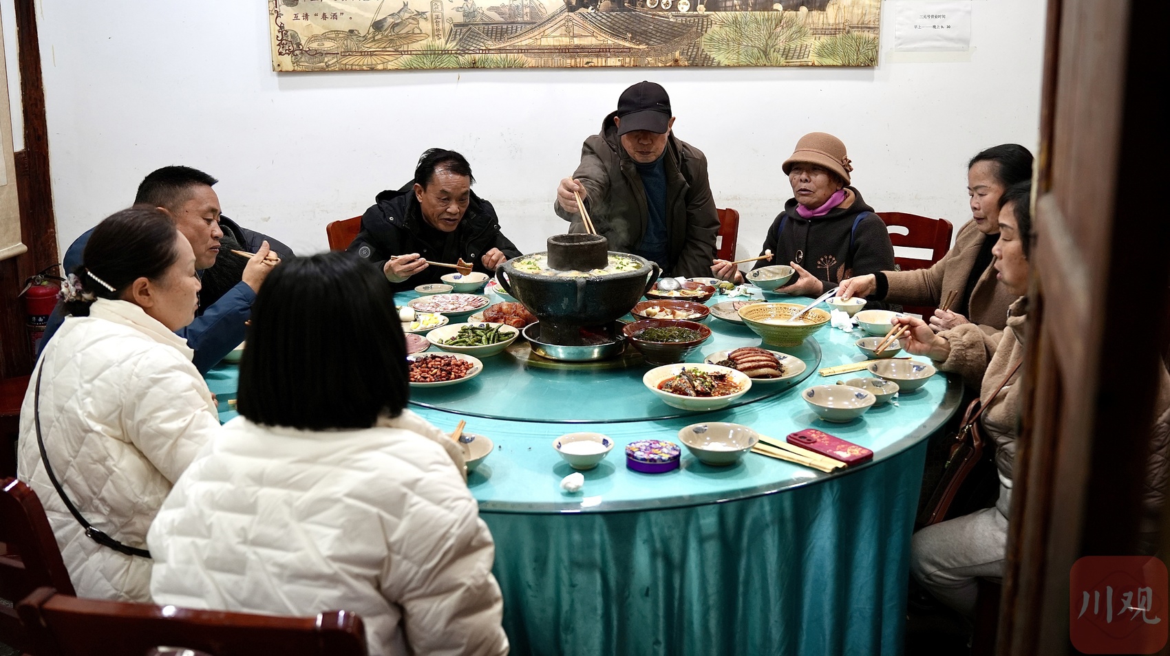53岁的曾仕强扛起装满菜品的木板,往返于厨房与客人之间。“临近春节,一天要摆八九十桌,最远的从内蒙古、黑龙江来,专门来体验。”连着送了几趟,他放下手里的木板,擦了把汗。