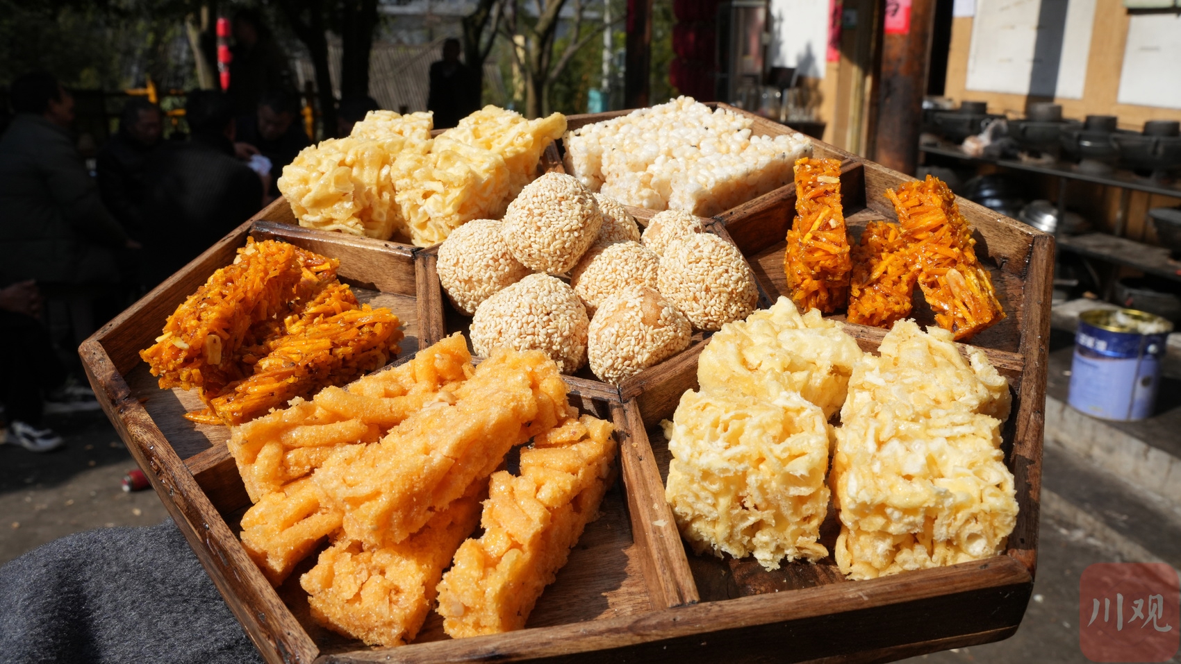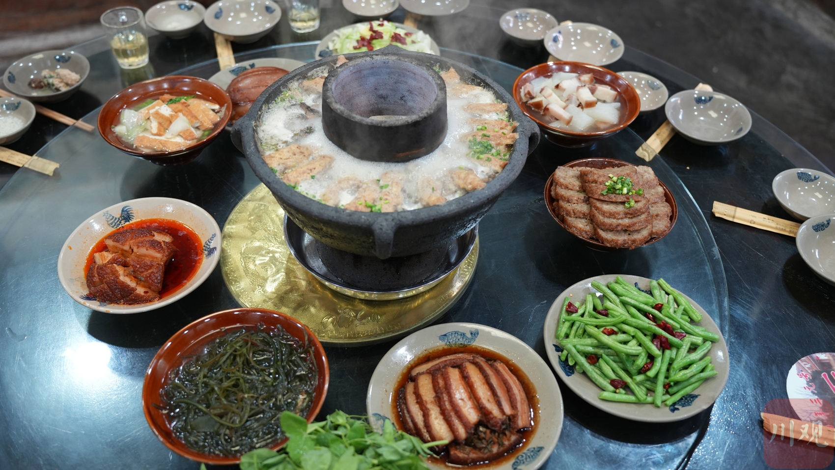 第一台是茶食,炒米糖、芝麻糖等装满木质盒子,配着清茶,供来得早的客人先食用。第二台是“干盘子”,香肠、腊肉、猪肝、猪心等腌制食品摆成佐酒小菜;第三台是“九大碗”,头碗、肘子、烧白、扣肉等荤菜和时蔬陆续上桌,最后压轴的,是咕噜噜冒着热气的高县土火锅。