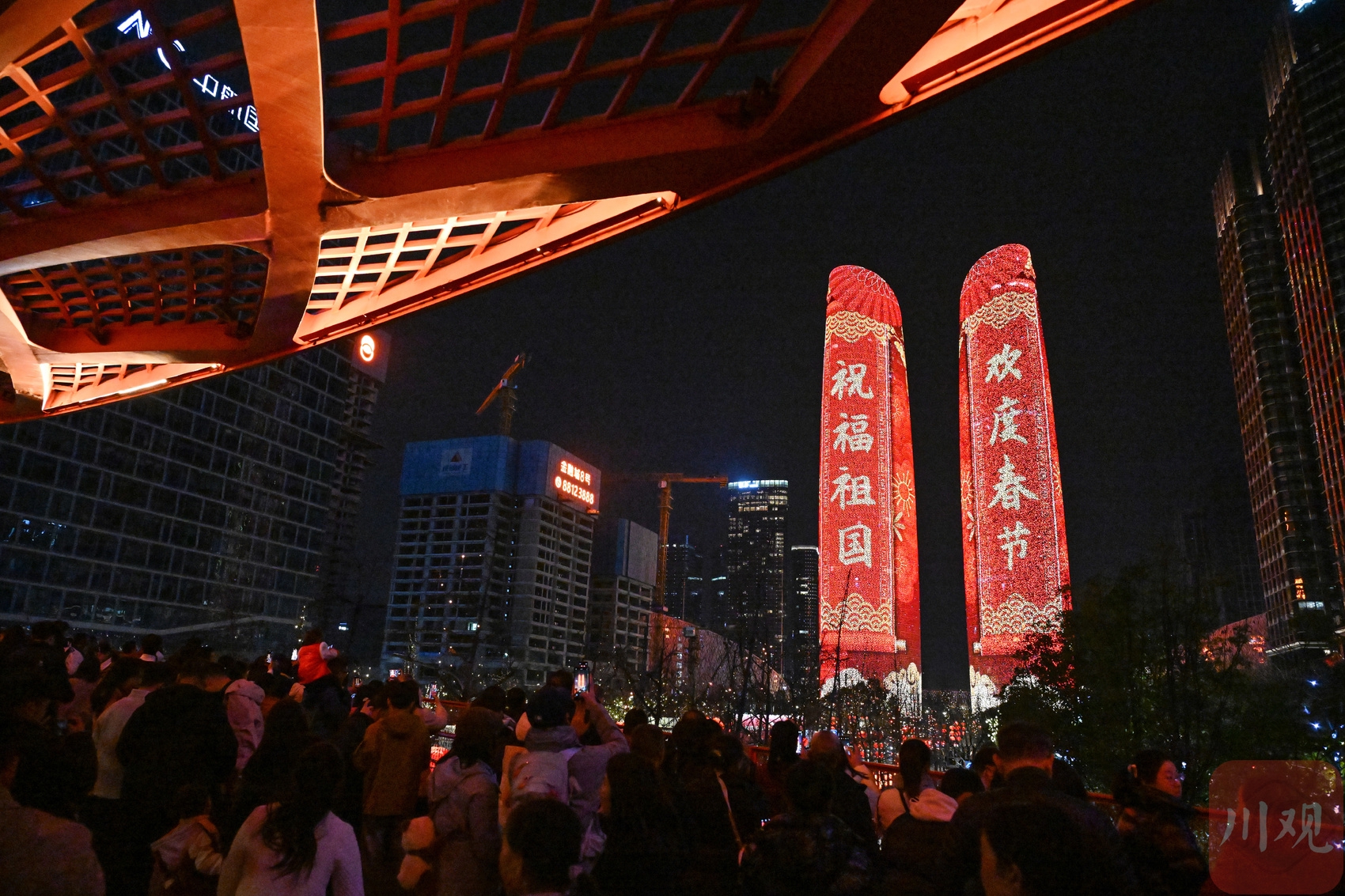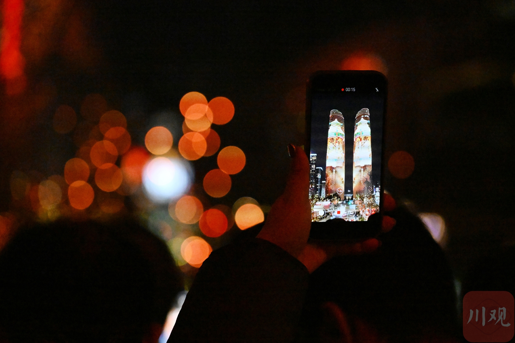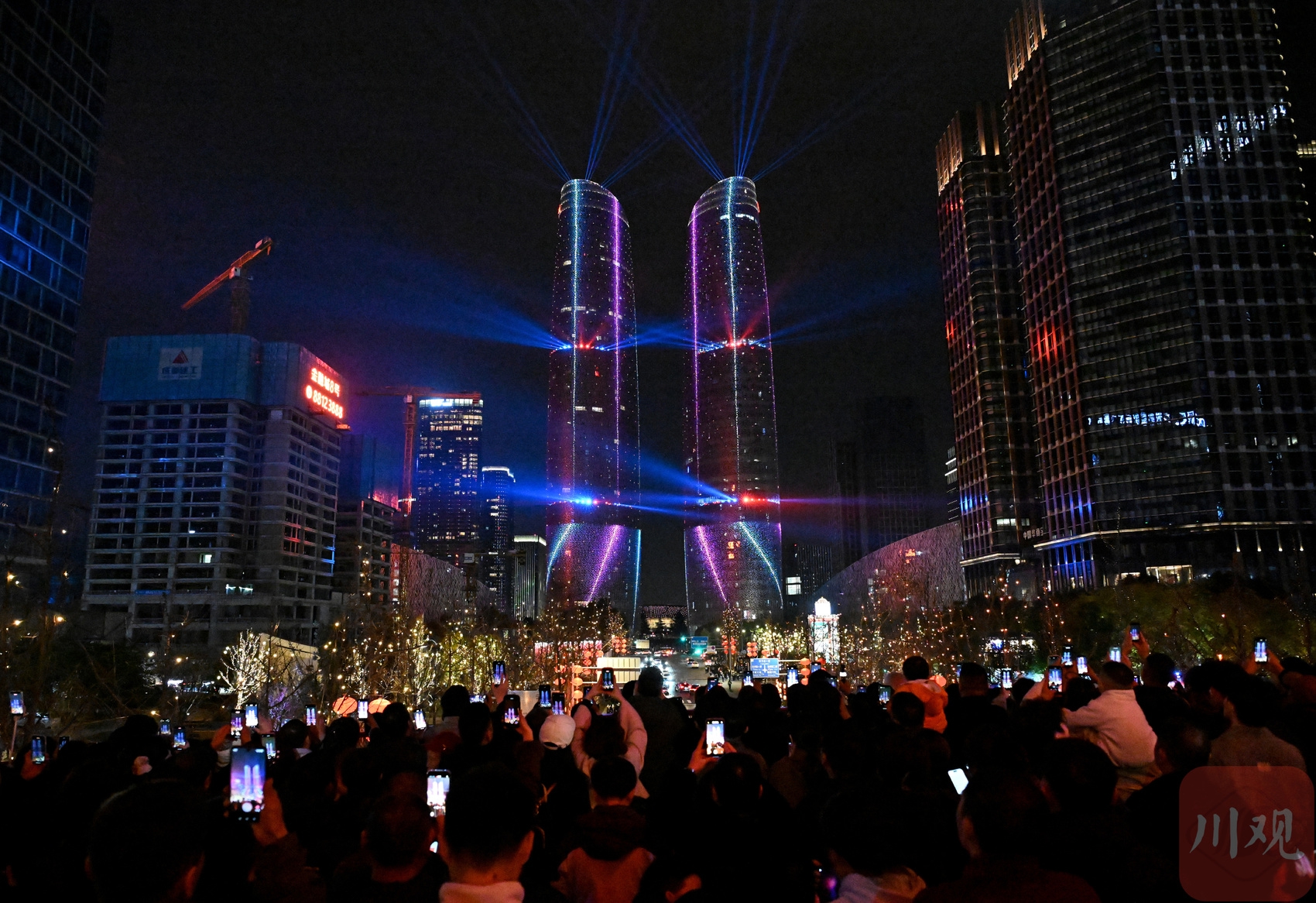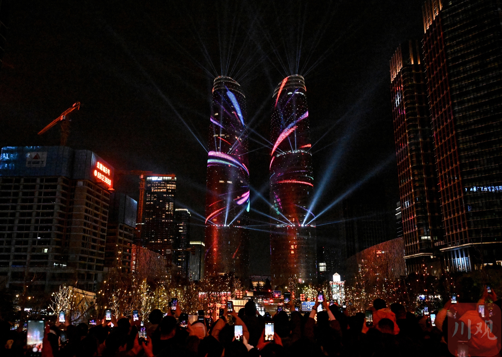 2026年2月16日除夕夜,璀璨夺目的成都双子塔灯光秀吸引众多市民和游客来此拍照打卡。