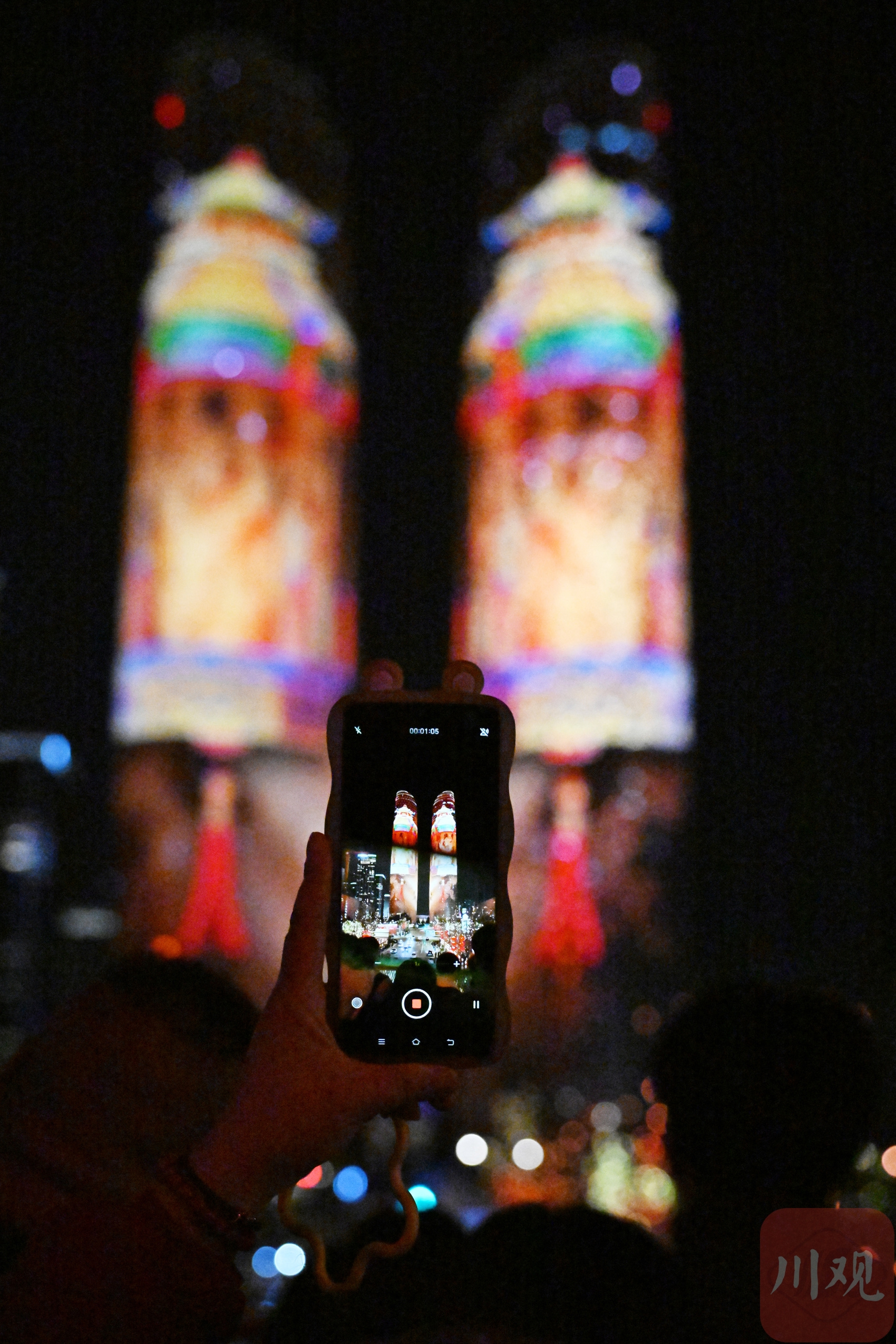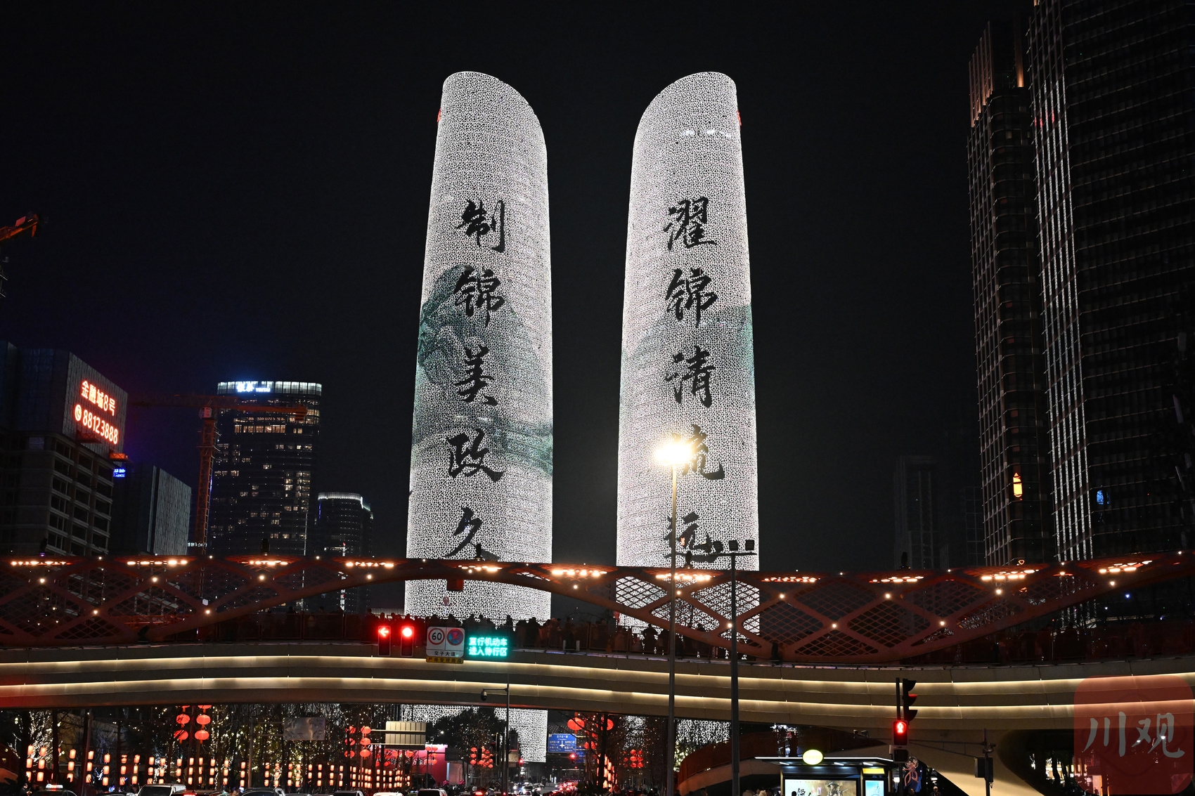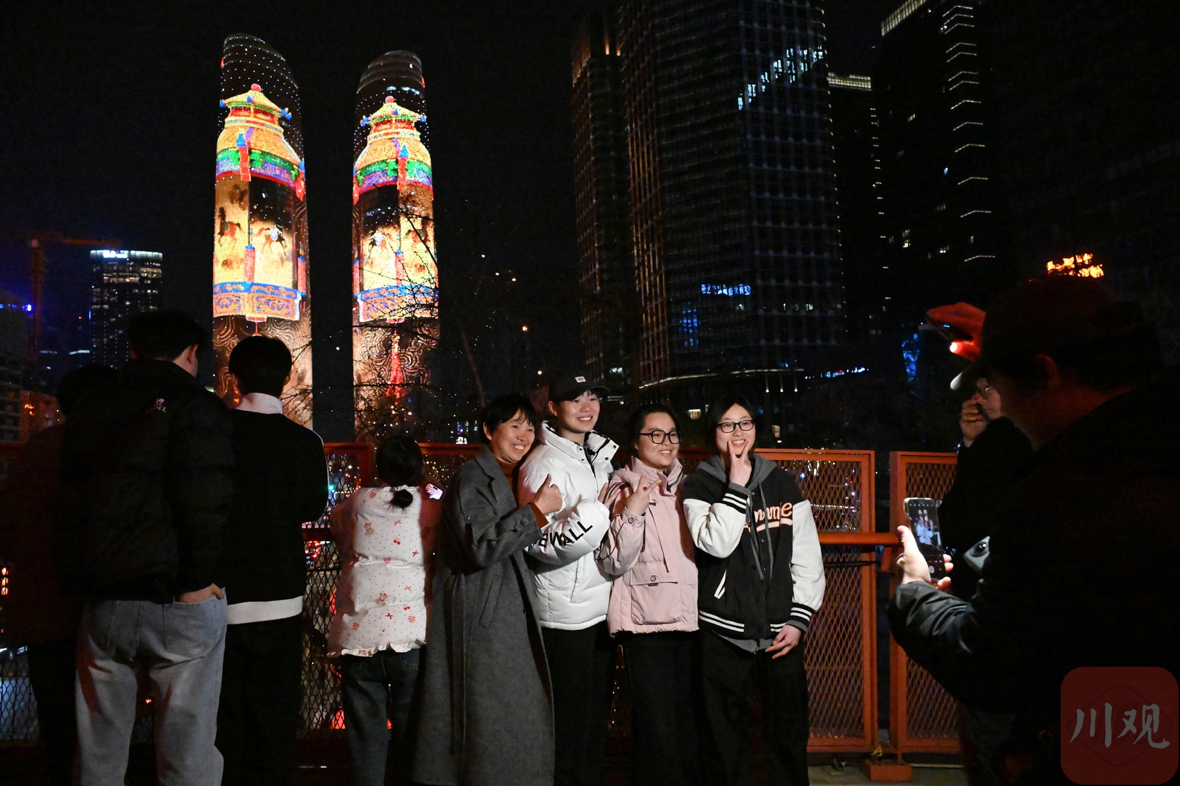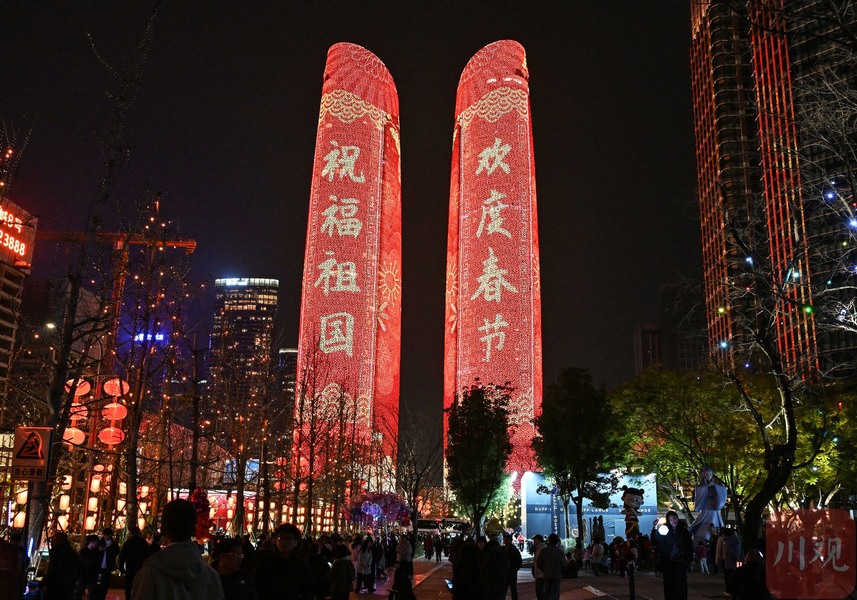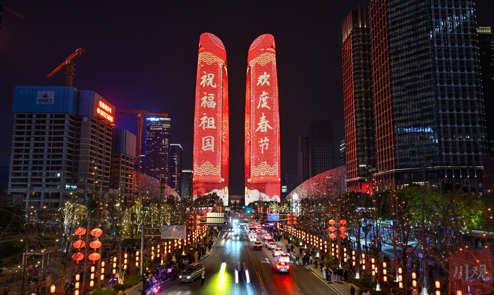 2026年2月16日除夕夜,璀璨夺目的成都双子塔灯光秀吸引众多市民和游客来此拍照打卡。