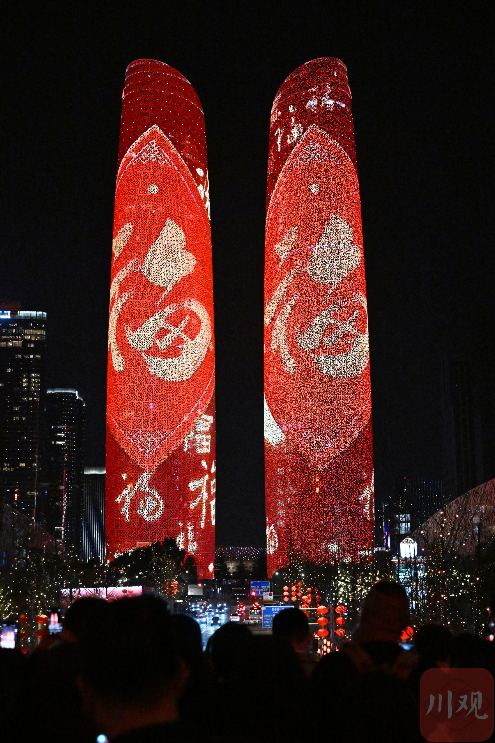 2026年2月16日除夕夜,璀璨夺目的成都双子塔灯光秀吸引众多市民和游客来此打卡。