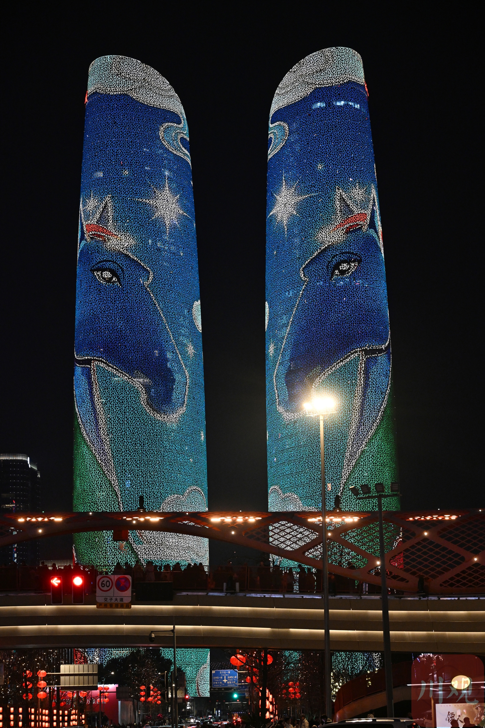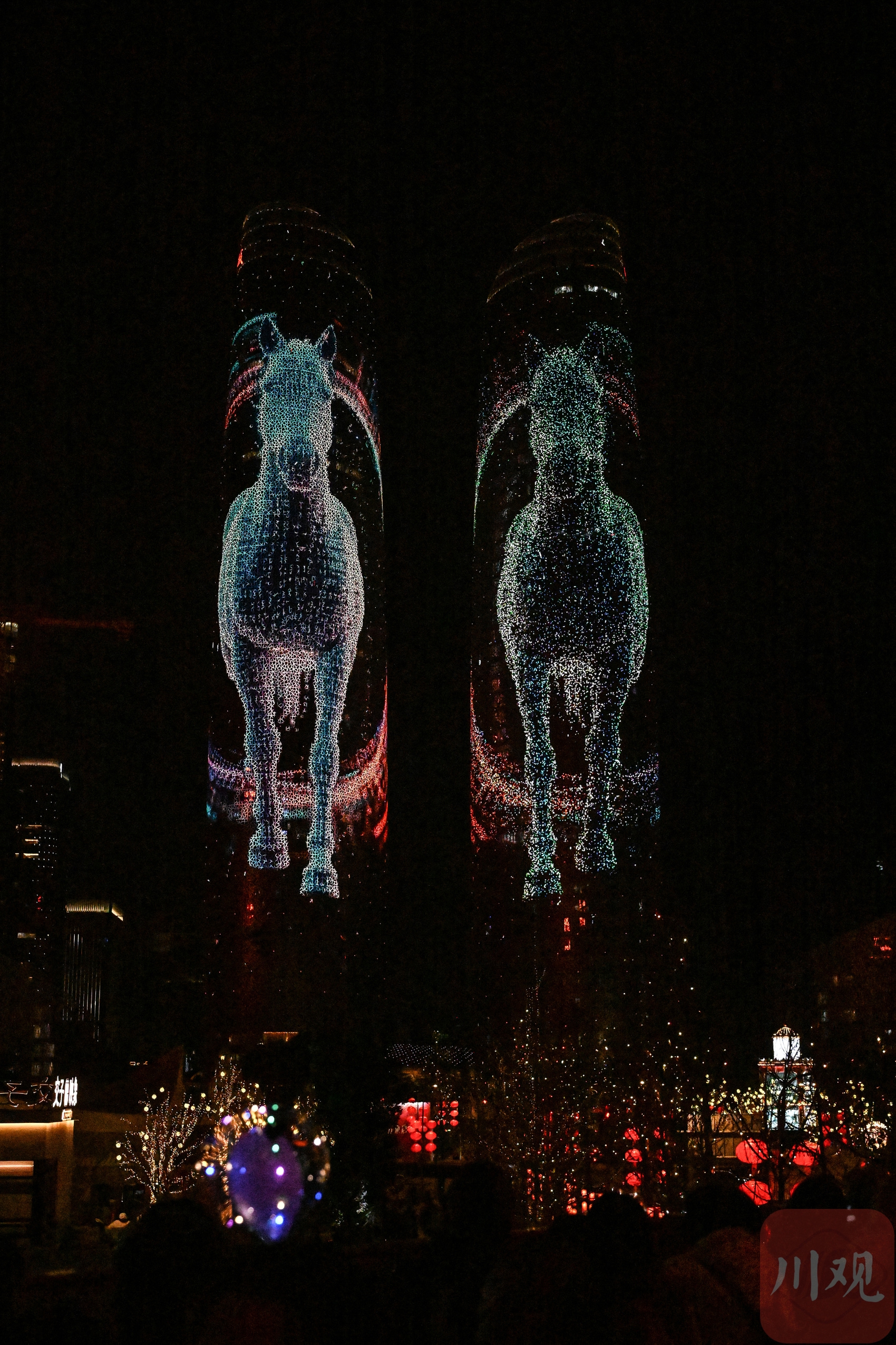 “天马行空”“马到成功”“策马奔腾”“龙马精神”……在现场,双塔围绕“新春马年”这一核心,用充满年味儿的主题灯光秀,呈现幸福烟火的年味场景,带来新春的祝福与好运,向市民和游客花式拜年。