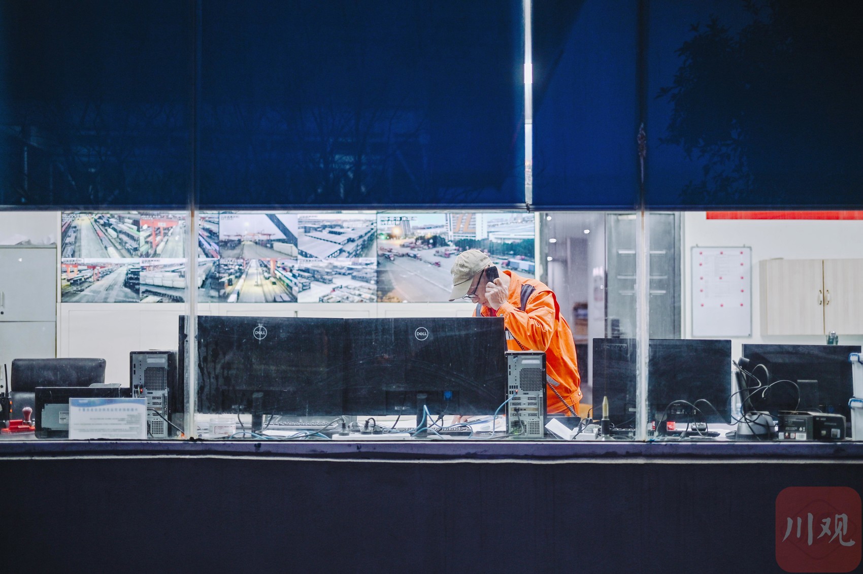 成都国际铁路港,货运员罗华兵正在检查吊运的集装箱,当晚为了监控货运安全,他要往返步行6公里的距离。