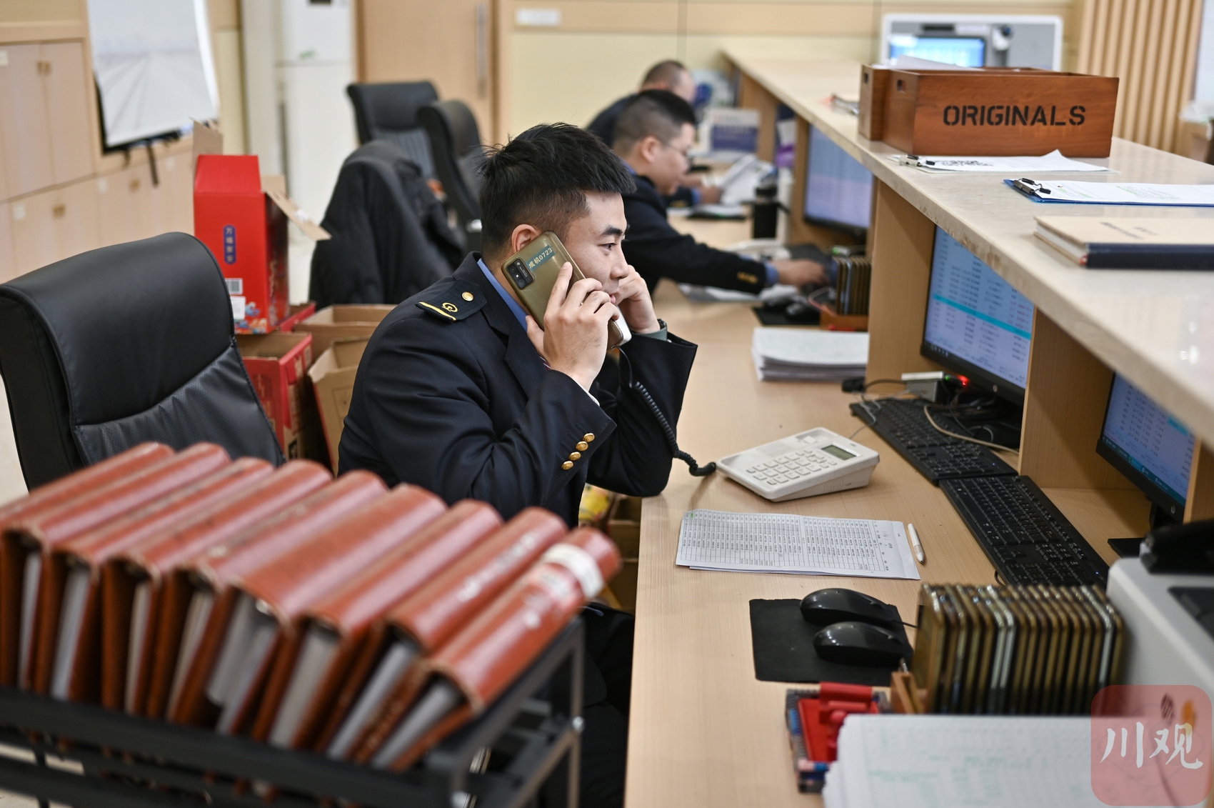 中铁联集成都中心站调度室,调度员何勋正在接列车调度电话。