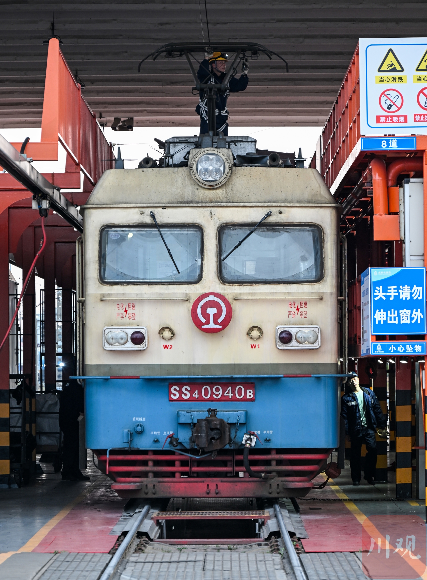 成都机务段整备车间内,工作人员正在检查列车的受电弓。