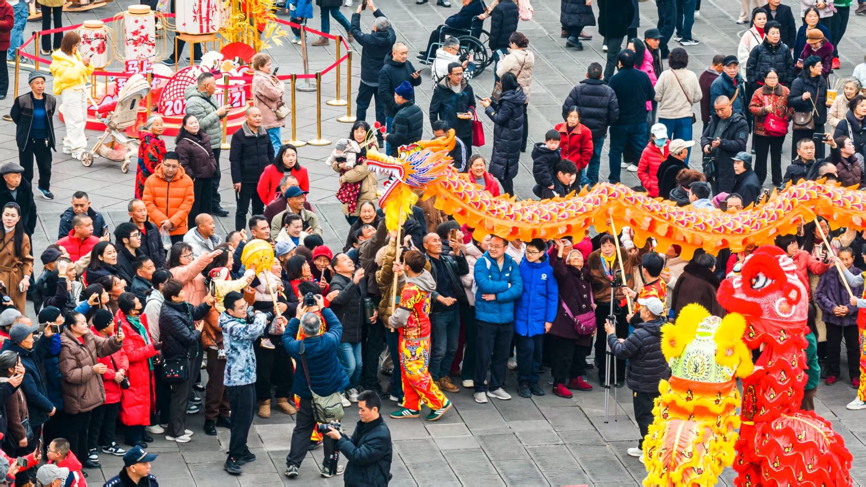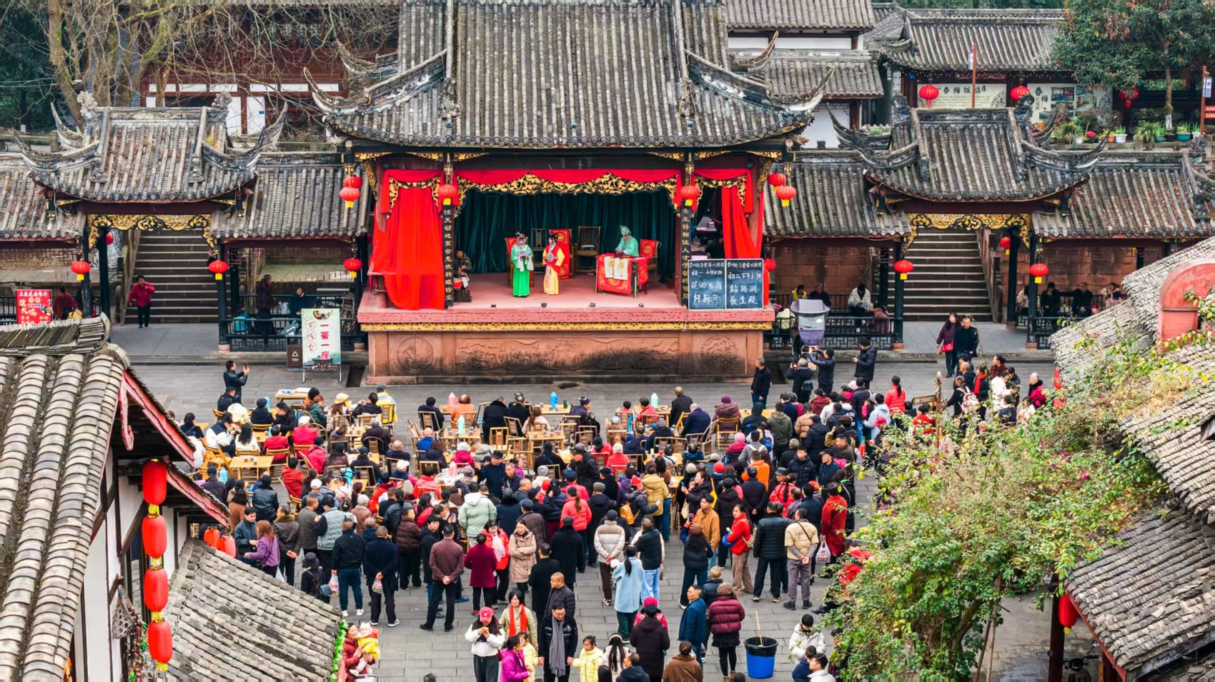 2月17日,大年初一,崇州街子古镇人流如潮,年味十足。舞龙舞狮、古戏台川剧演出、传统长街宴等活动营造出热闹喜庆的节庆氛围。