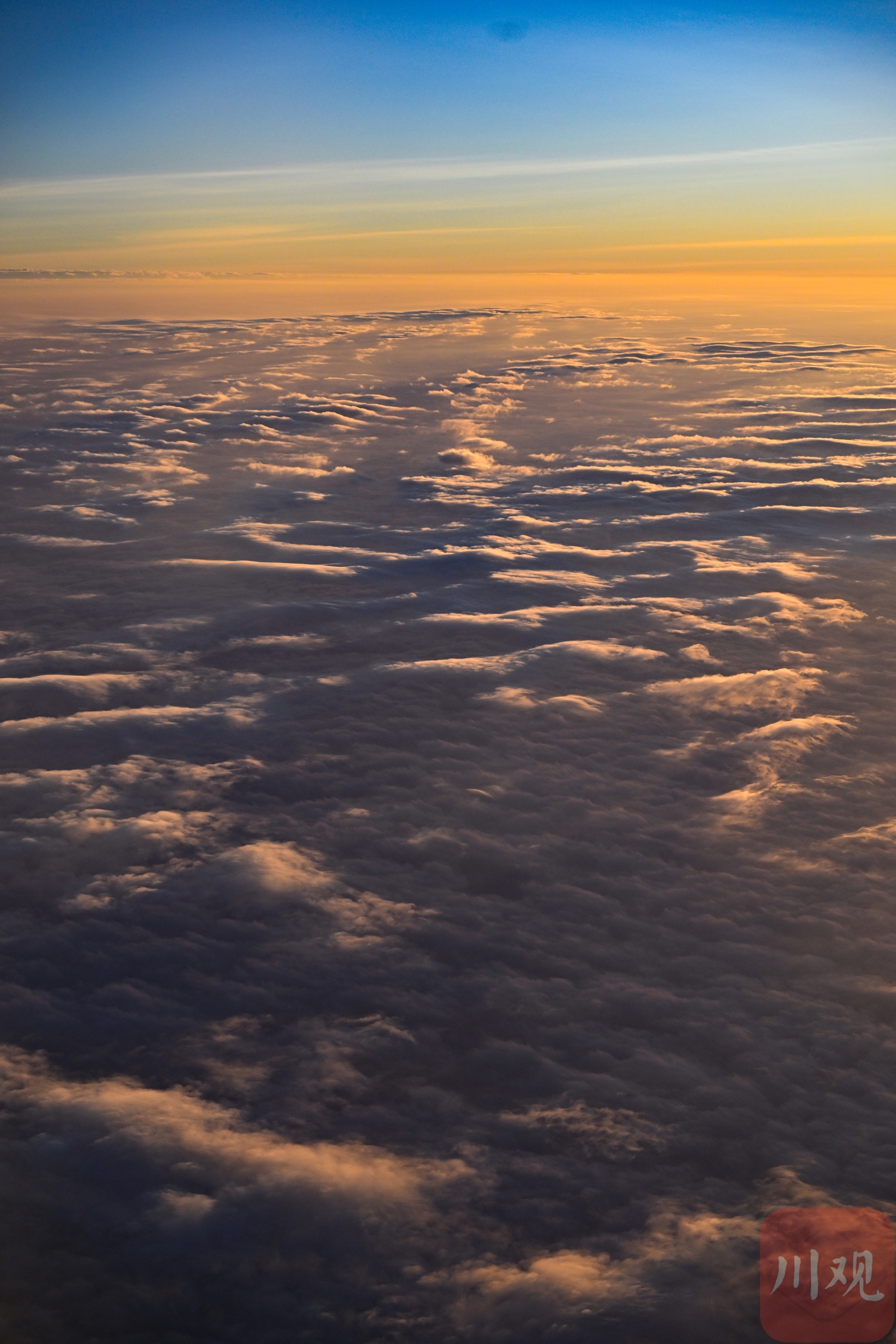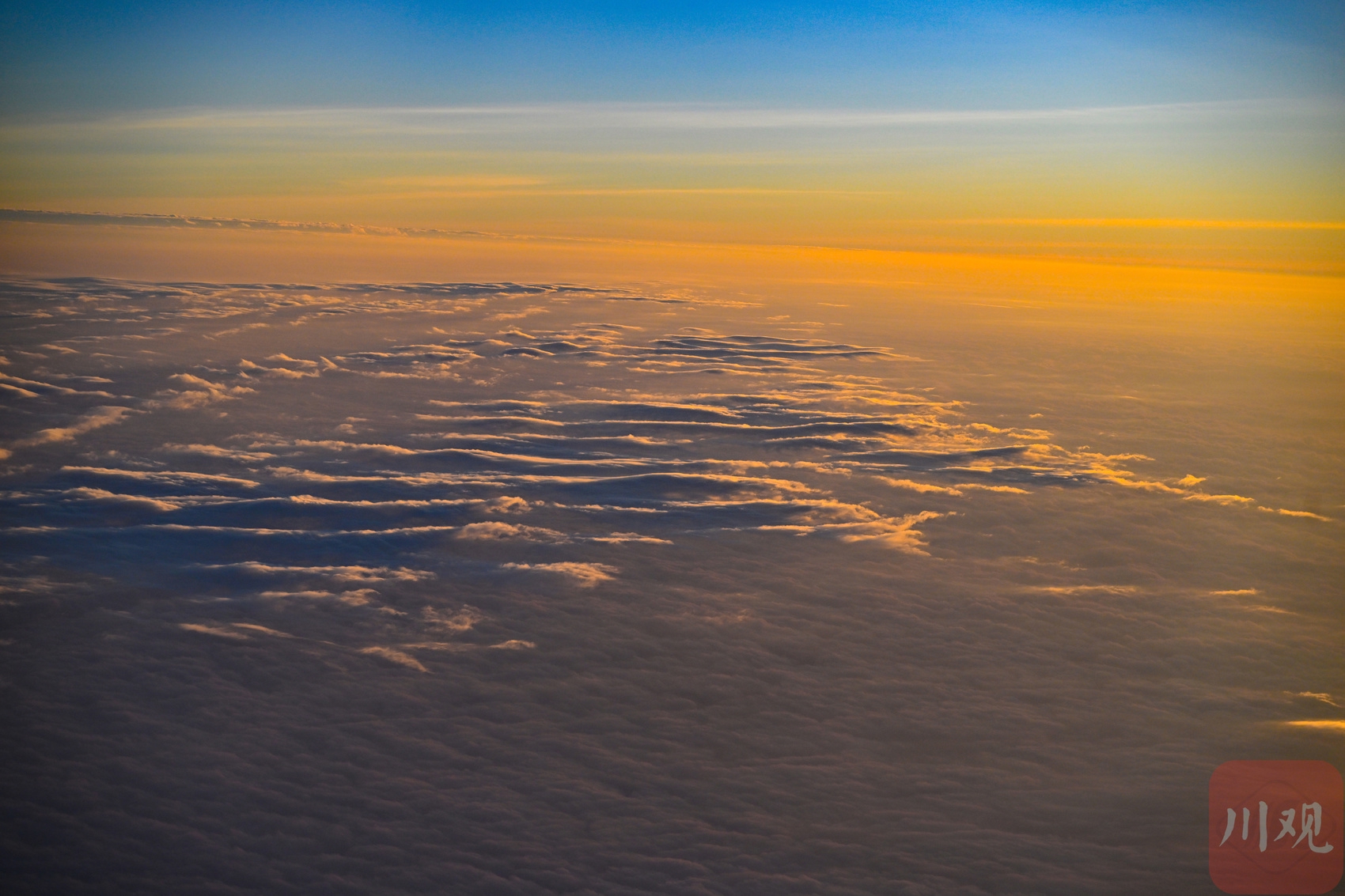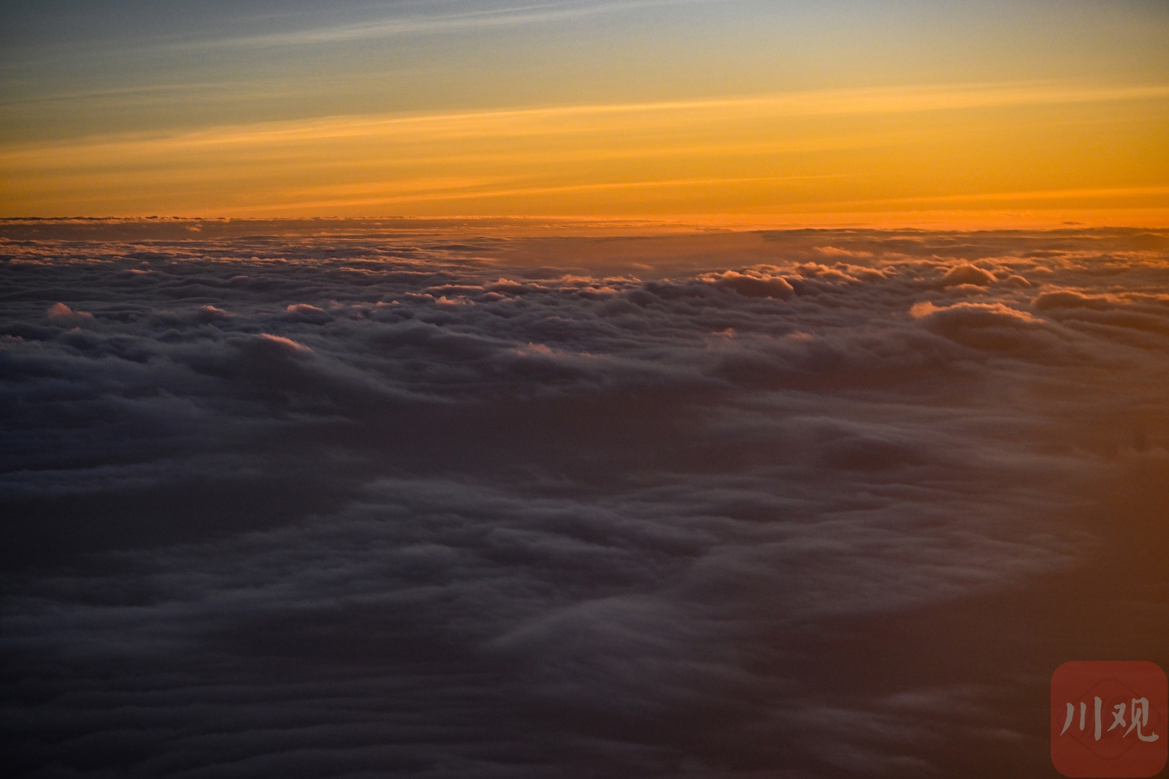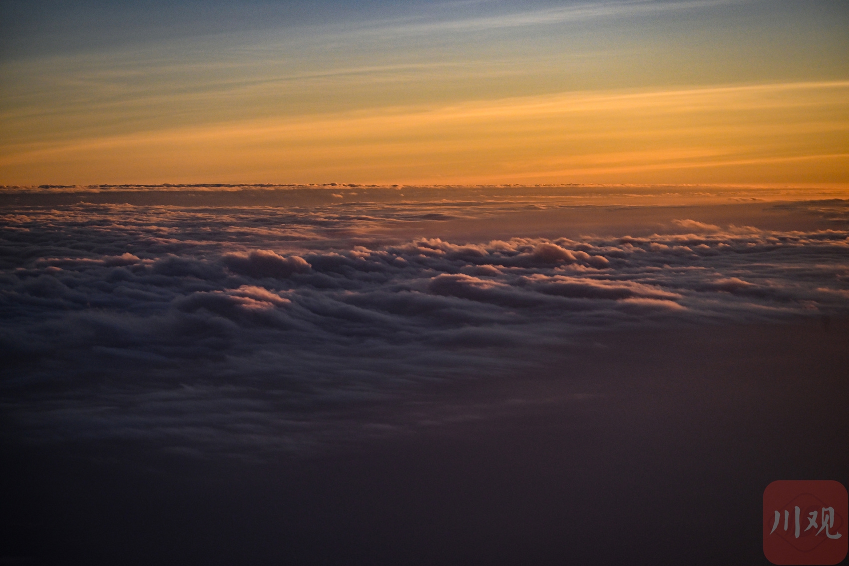 2026年2月17日傍晚,记者在成都飞往珠海的航班上俯瞰,万米高空下云海层峦叠嶂、薄雾环绕,在落日余晖的衬托下美不胜收。