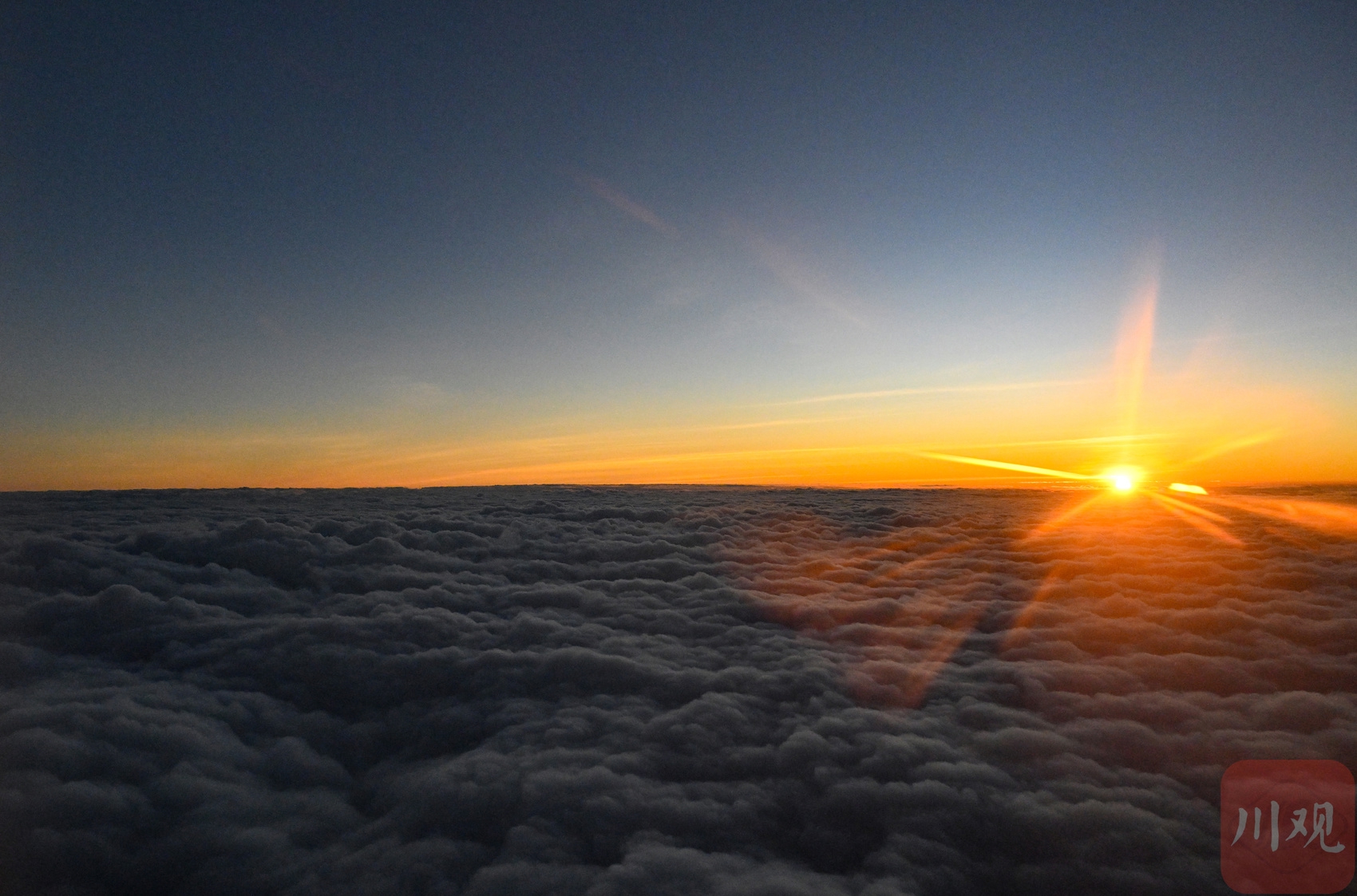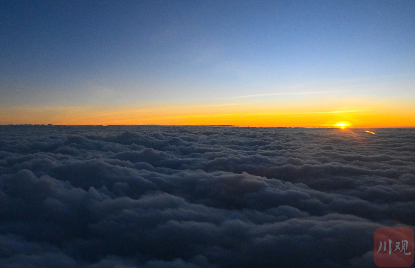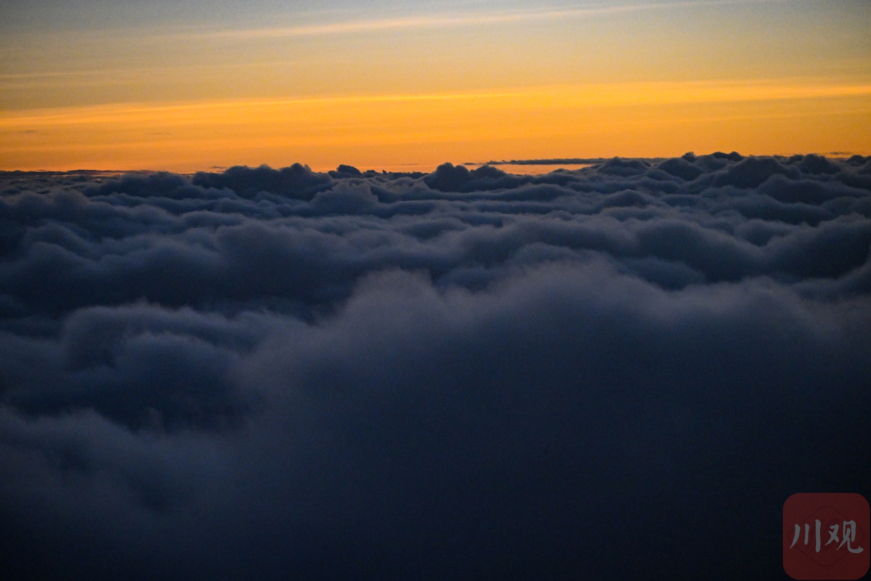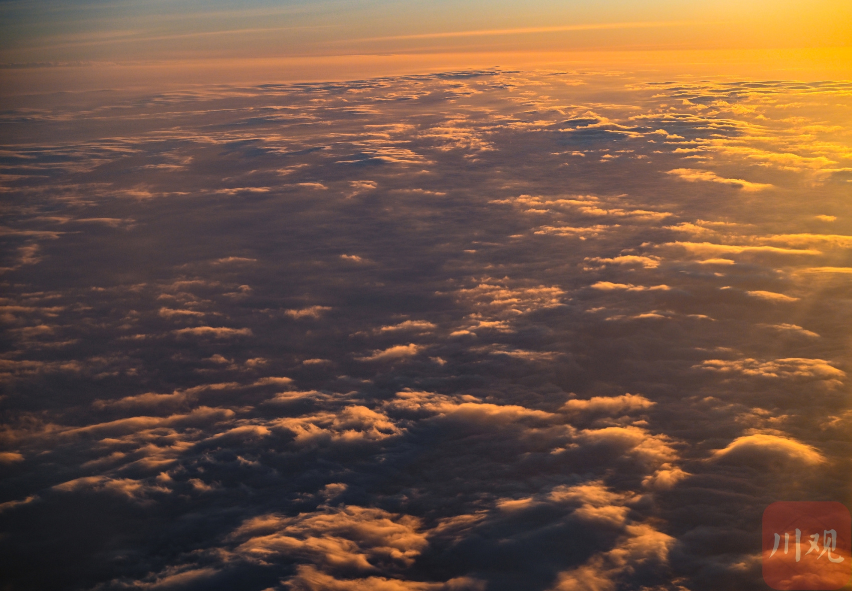 2026年2月17日傍晚,记者在成都飞往珠海的航班上俯瞰,万米高空下云海层峦叠嶂、薄雾环绕,在落日余晖的衬托下美不胜收。