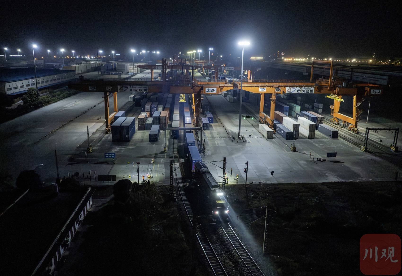 2月16日晚,中铁联集成都中心站,龙门吊吊起集装箱。