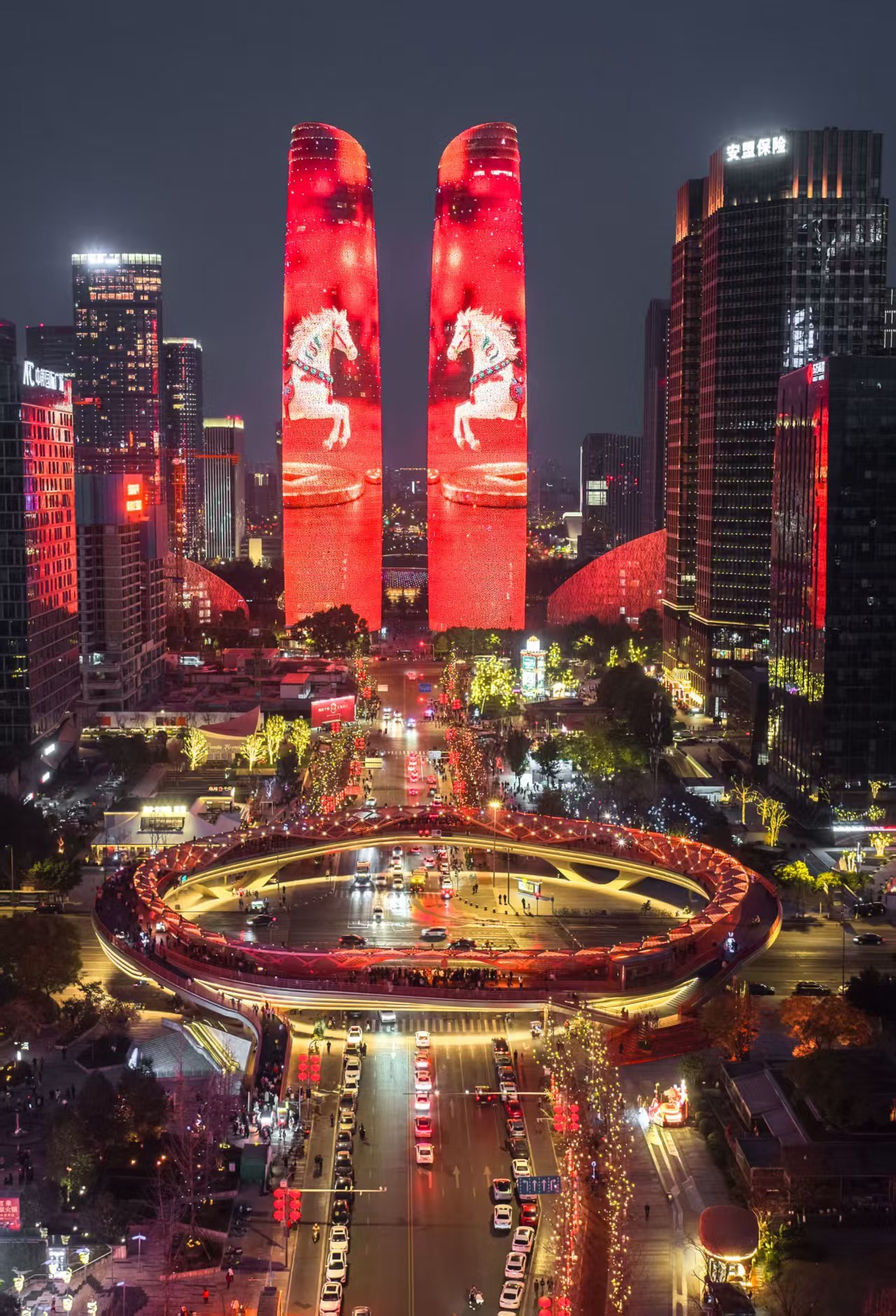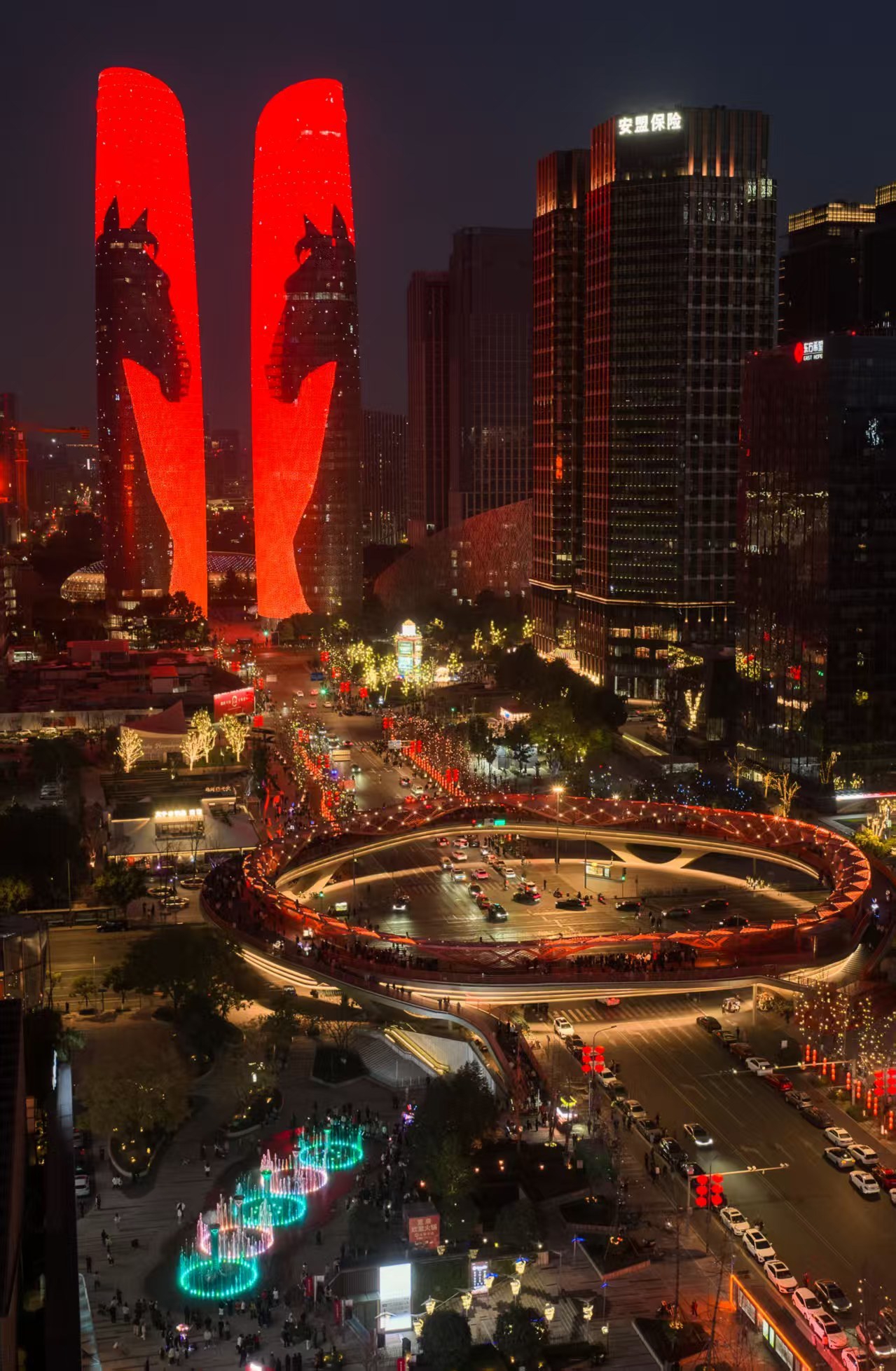 值得注意的是,除了除夕,初一至初七的19:00-24:00(三场整点灯光秀时间为20:00、21:00、22:00),天府双塔都会呈现巨型春联、我爱成都、云看大熊猫等新春传统元素与数字创意光影相融合的主题灯光秀,向在蓉市民游客花式拜年。