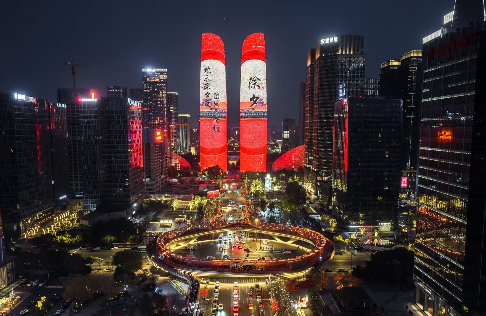 巨型春联、十二生肖拜大年……2月16日除夕夜,成都高新区天府双塔光影绽放,拉开了新春主题灯光秀的序幕。