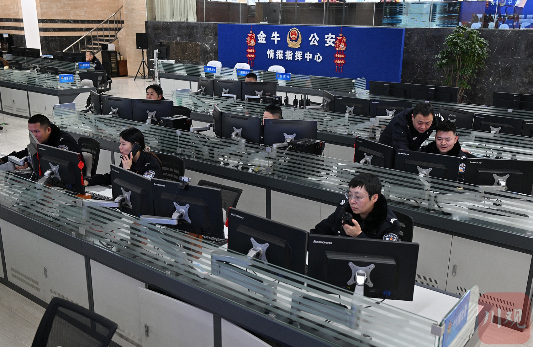 2月18日上午,成都市公安局金牛区分局情报指挥中心的10余名民辅警正在开展新一轮值守。作为警徽后的“最强大脑”,这里24小时不打烊、365天不间断,平均每天接处警500余起。