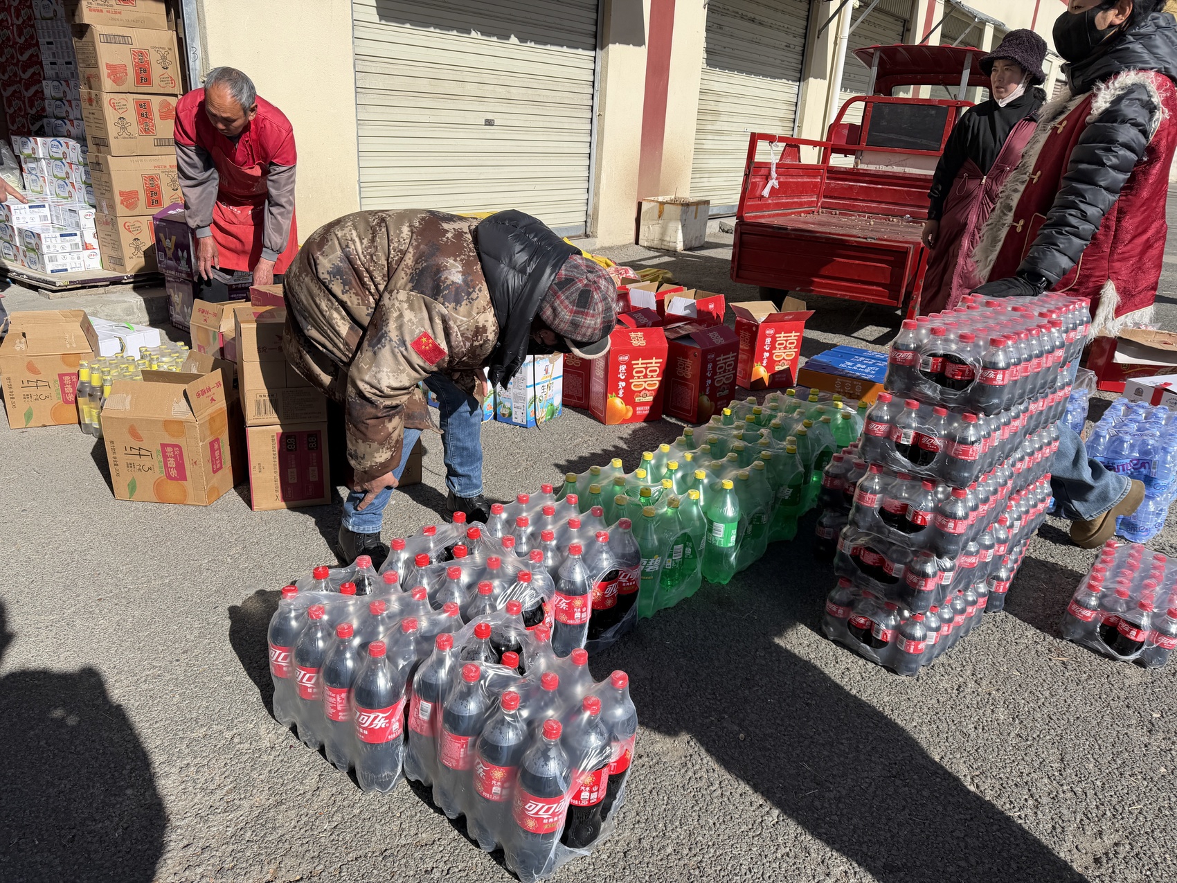 她说的“那口子”,是丈夫索朗多杰,道孚本地的康巴汉子。当年两人因生意结识、相恋、成家。这会儿,索朗多杰正埋头搬饮料箱子,一箱一箱摞得齐整。采访全程,这个康巴汉子话不多,只是默默收拾货架,偶尔抬头用汉语提醒一句:“慢点,注意腰。”