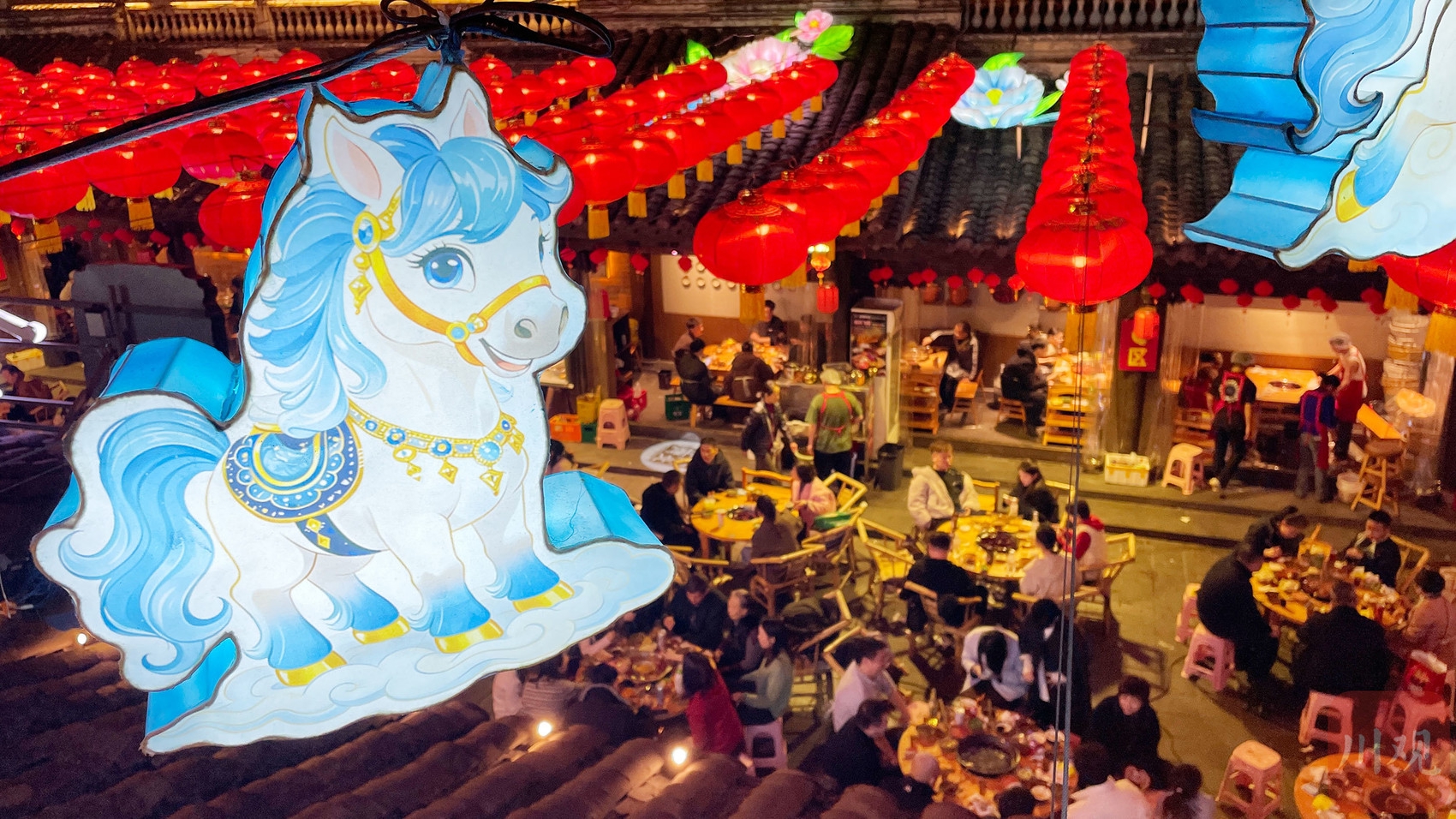 青砖灰瓦间,红灯笼高挂,马年主题灯组亮眼夺目。街区内游人如织,市民游客或游园赏灯,或喝茶闲谈,特色小吃、民俗市集一应俱全,处处洋溢着喜庆祥和的节日氛围。