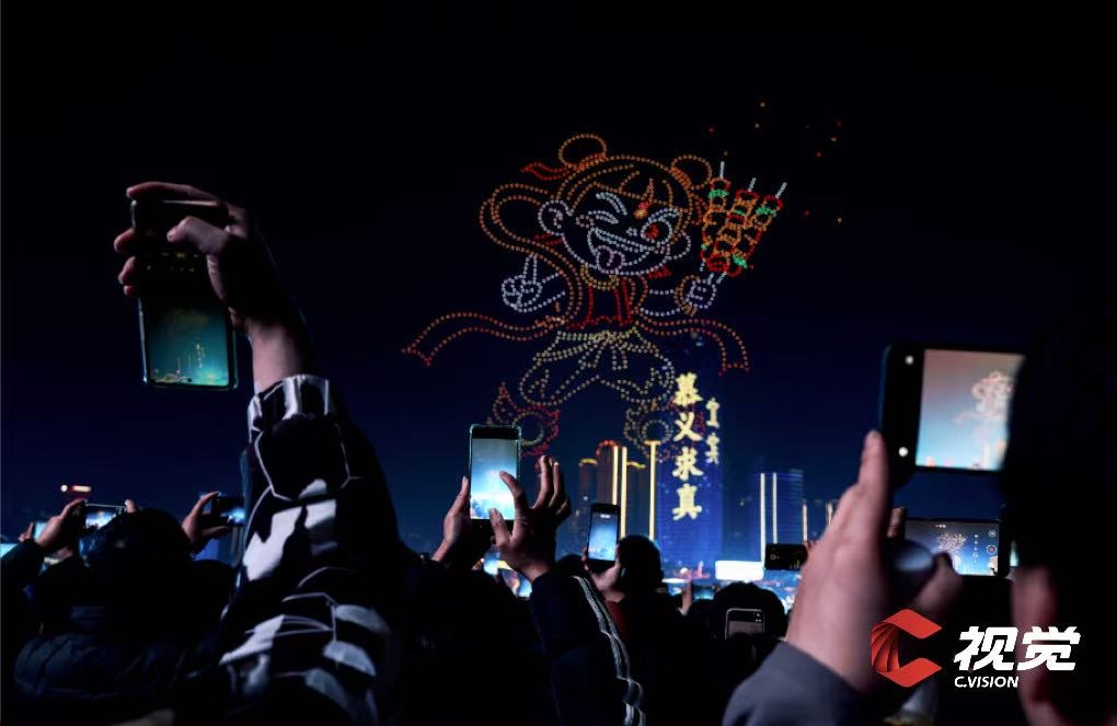 2026年2月18日,在宜宾市翠屏区合江门广场,游客们纷纷用手机记录下无人机灯光秀,打卡央视春晚分会场同款江景。C视觉签约摄影师 郑欣 摄