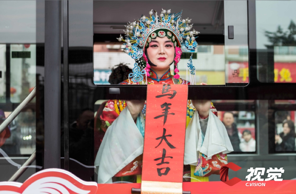 2026年2月17日,南充市嘉陵区组织的拜年活动中,戏曲演员穿上戏服,坐在公交车上,给群众拜年。C视觉签约摄影师 龙进文 摄
