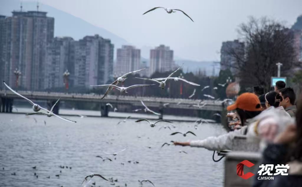 2026年2月18日,雅安市雨城区青衣江畔,海鸥与游人嬉戏,呈现人与海鸥和谐共处的美好画面。C视觉签约摄影师 祝纯健 摄