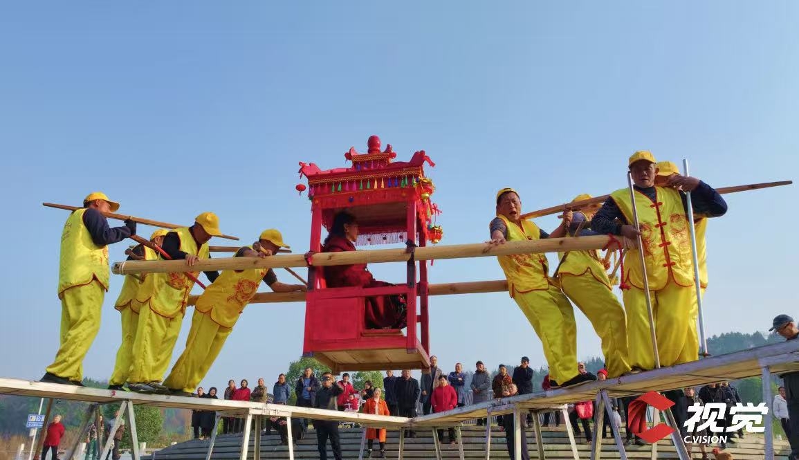 2026年2月19日,在眉山市仁寿县文宫镇文化广场,抬工号子表演队正在表演板凳上抬花轿。C视觉签约摄影师 潘帅 摄