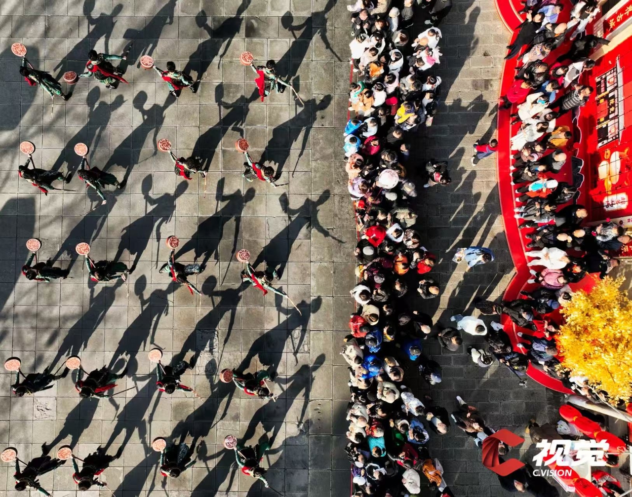 2026年2月19日,南充市阆中古城阳光明媚。贡院广场巴象鼓表演,吸引了众多游客观赏互动、打卡拍照。C视觉签约摄影师 梁德 摄
