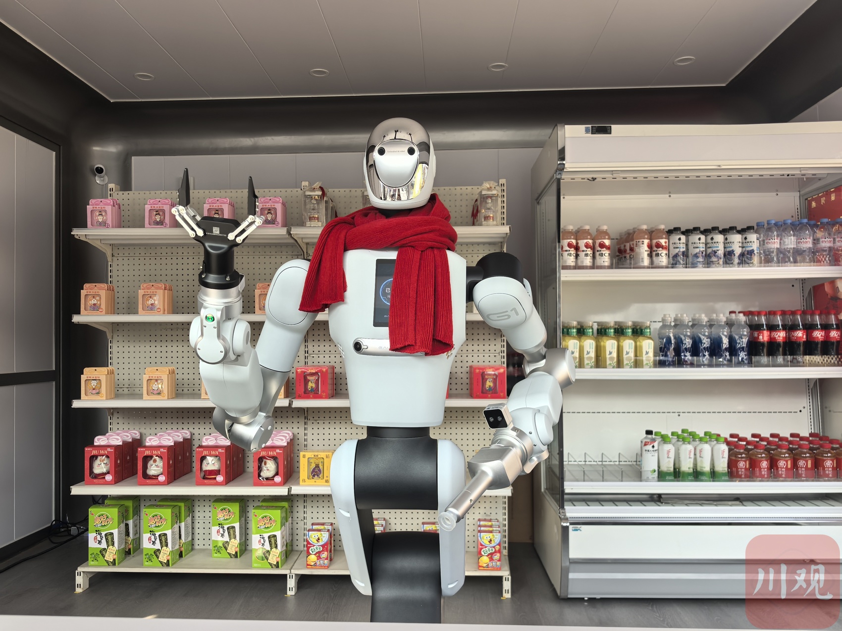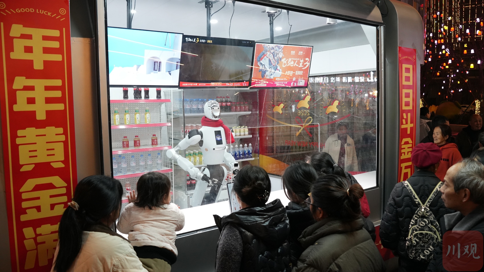 2月18日,农历正月初二,万象宜宾天地游人如织,“无人零售太空舱”里,饮料、盲盒等产品丰富,售卖产品的“打工人”,是一个系着红色围巾的银白色机器人。游客孙先生拿出手机,扫码选了一瓶茶饮料,太空舱内响起语音:“您有新的订单,请及时处理。”收到指令后,机器人滑动轮足来到货架前,精准抓取商品并稳稳地放回取餐口,整个过程行云流水。