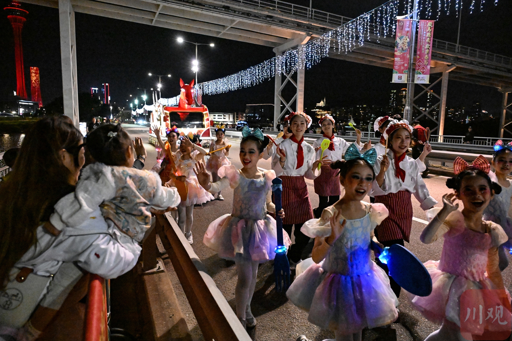2026年2月19日晚,花车汇演队伍在澳门街头巡游。