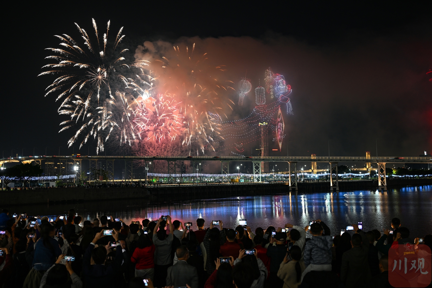2026年2月19日晚,澳门无人机烟花汇演吸引大批游客前来观赏。