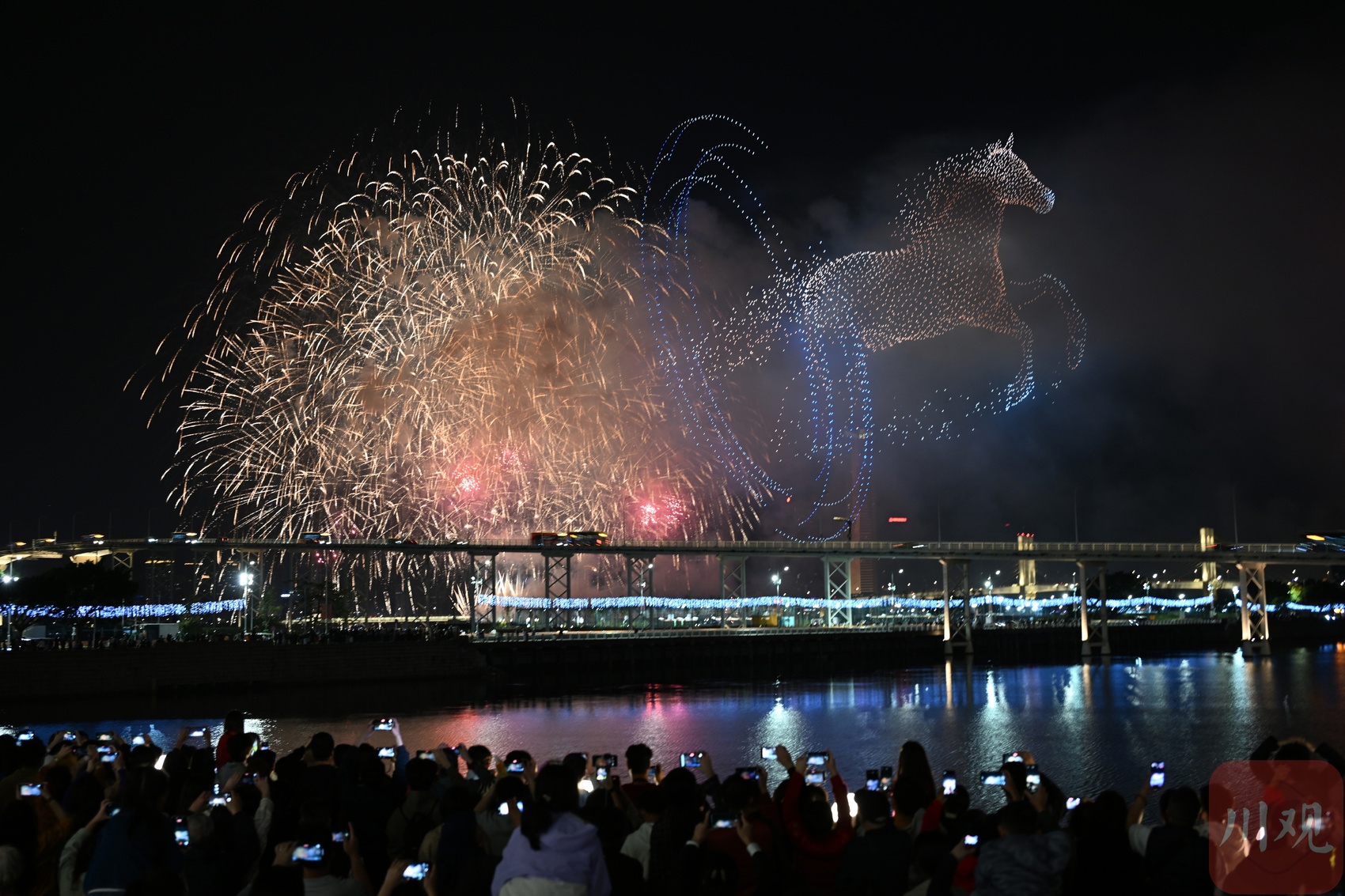 当晚,“金骏云翔 欢乐春节”2026无人机烟花汇演同步亮相,无人机与烟花创意融合,璀璨光影点亮澳门夜空,为海内外游客献上一场震撼视听的新春盛宴。