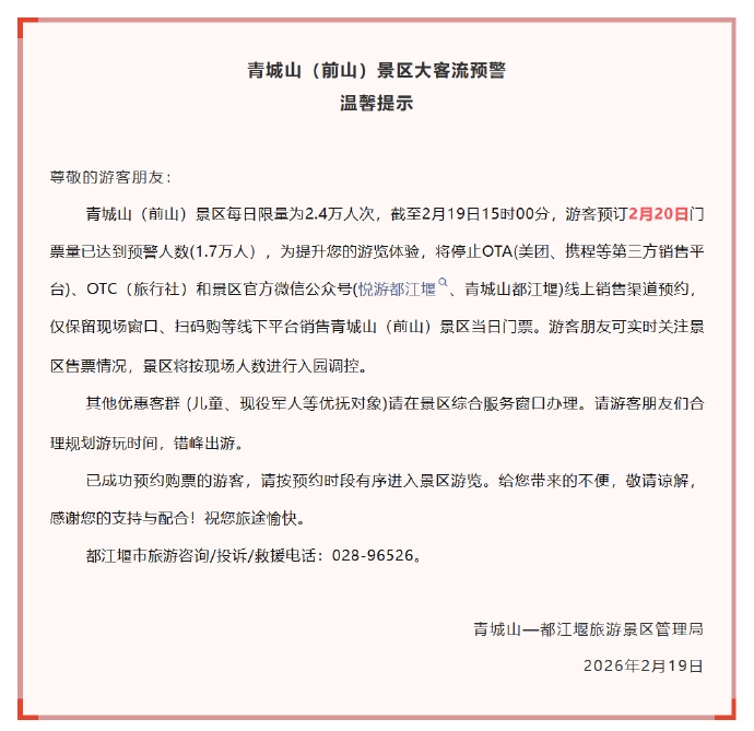 截至2月19日15时,青城山(前山)景区2月20日门票预订量已达到预警人数1.7万人。景区已停止OTA(美团、携程等)、OTC(旅行社)及官方微信公众号“悦游都江堰”“青城山都江堰”线上销售渠道预约,仅保留现场窗口、扫码购等线下平台销售当日门票。景区将根据现场人数进行入园调控,请游客实时关注。