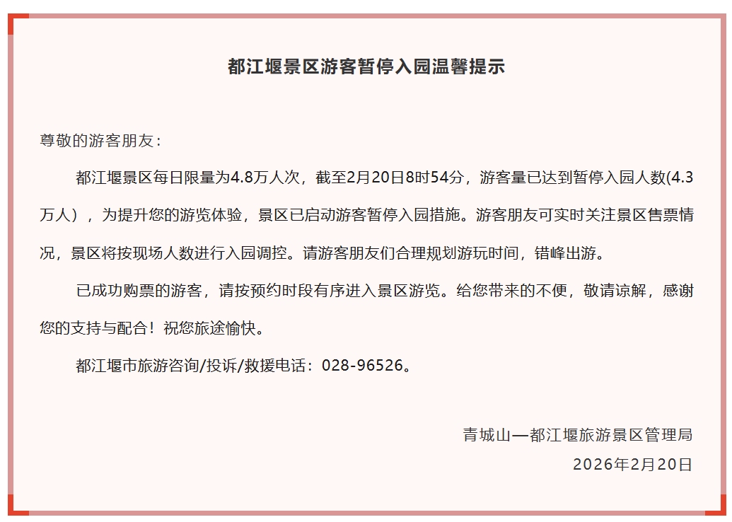 都江堰景区每日限量为4.8万人次,截至2月20日8时54分,游客量已达到暂停入园人数(4.3万人),景区已启动游客暂停入园措施。游客朋友可实时关注景区售票情况,景区将按现场人数进行入园调控。