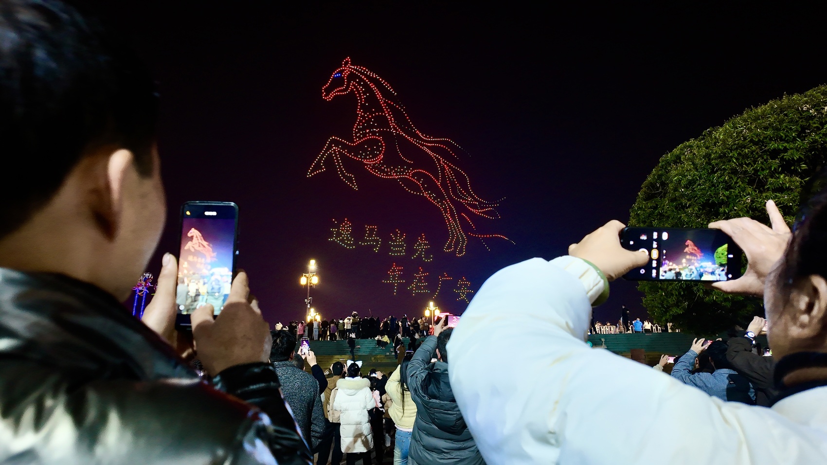 2月19日晚,在广安不夜城渠江段上空,一场“逸马当先·年在广安”新春无人机展演惊喜亮相,1300架无人机点亮渠江夜空,为市民游客送上一场别开生面的炫酷光影秀,恭贺马年新春。